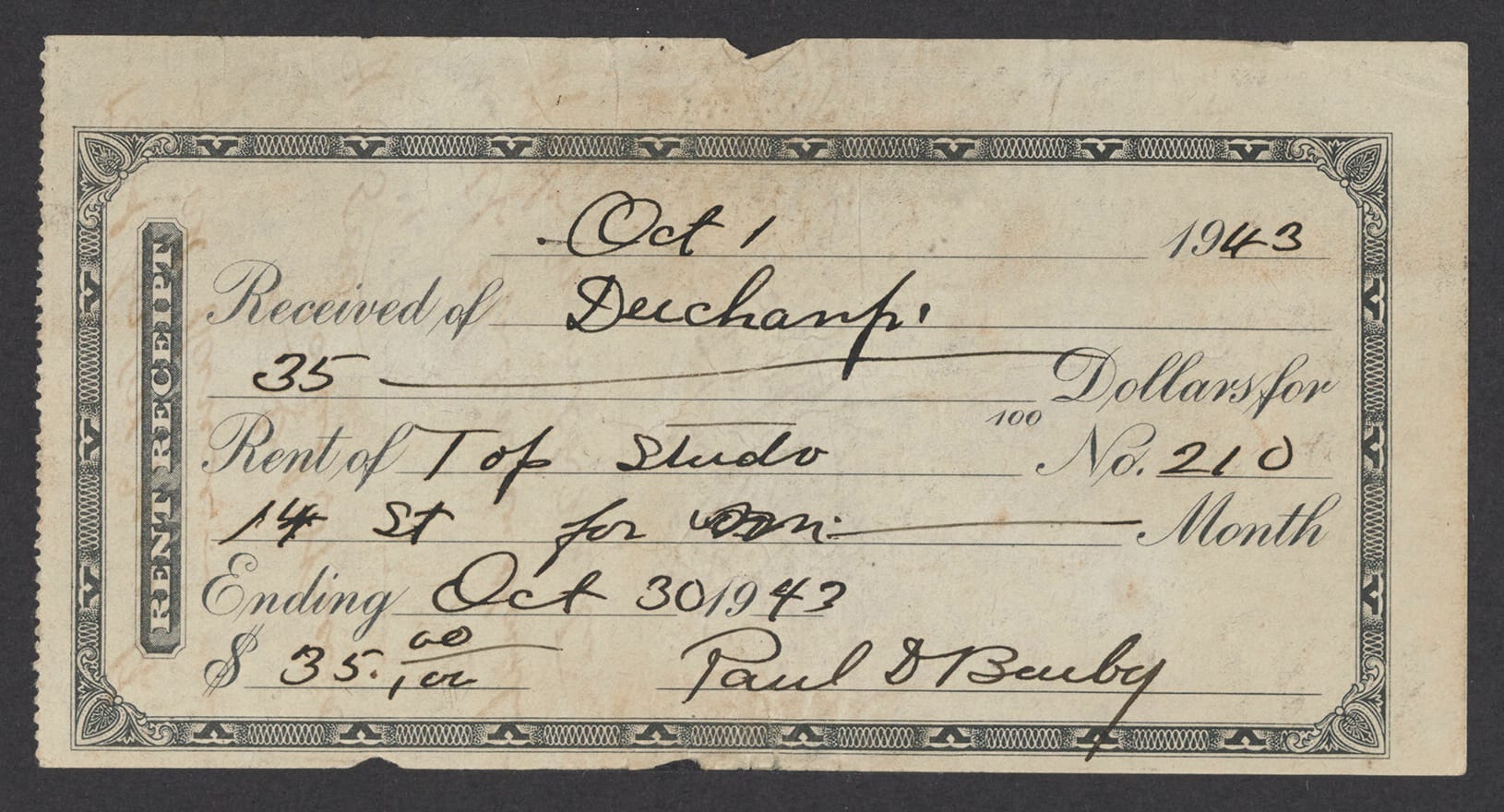 Receipt for rent of studio at 210 West 14th Street, New York City, October 1, 1943 (courtesy Philadelphia Museum of Art)