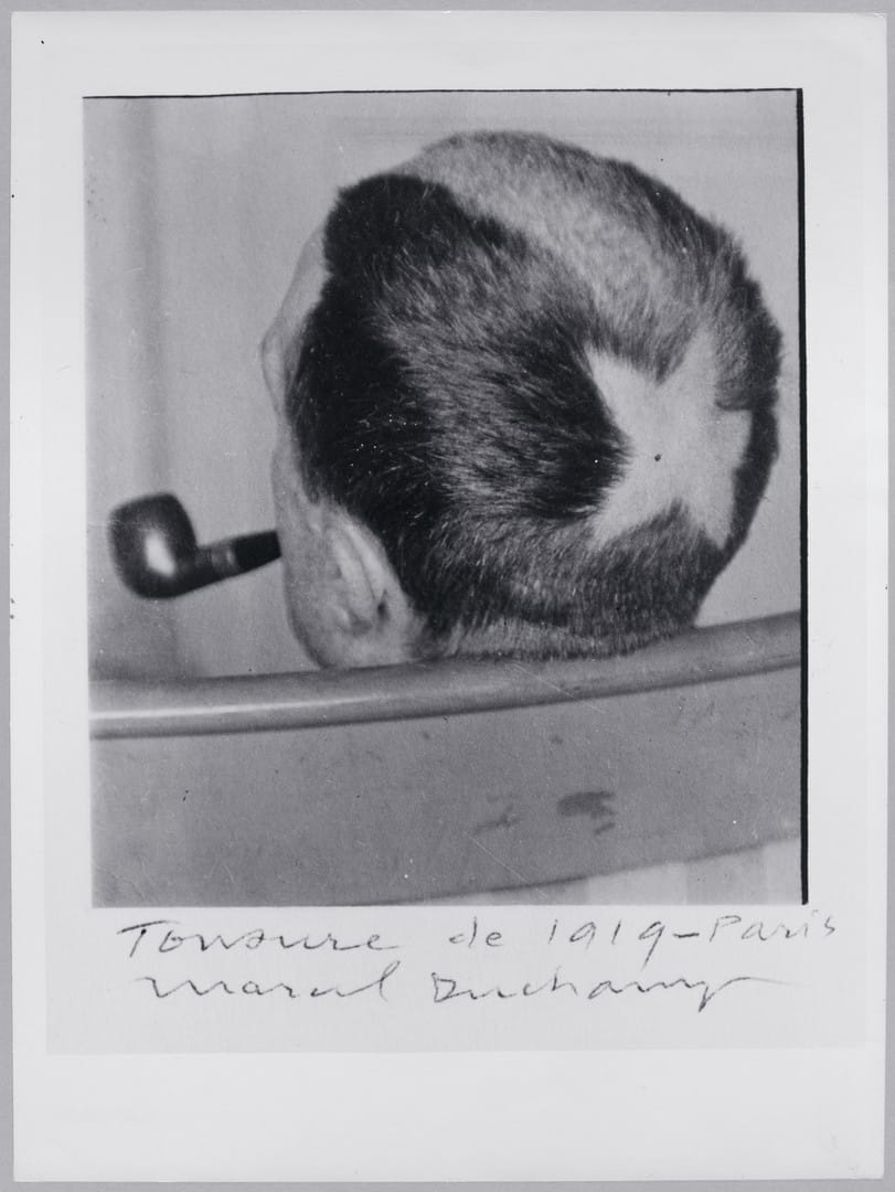 Reproduction of a photograph by Man Ray dated in 1919 showing Marcel Duchamp from behind with a tonsure in the shape of a comet, 1921 (courtesy Centre Pompidou)