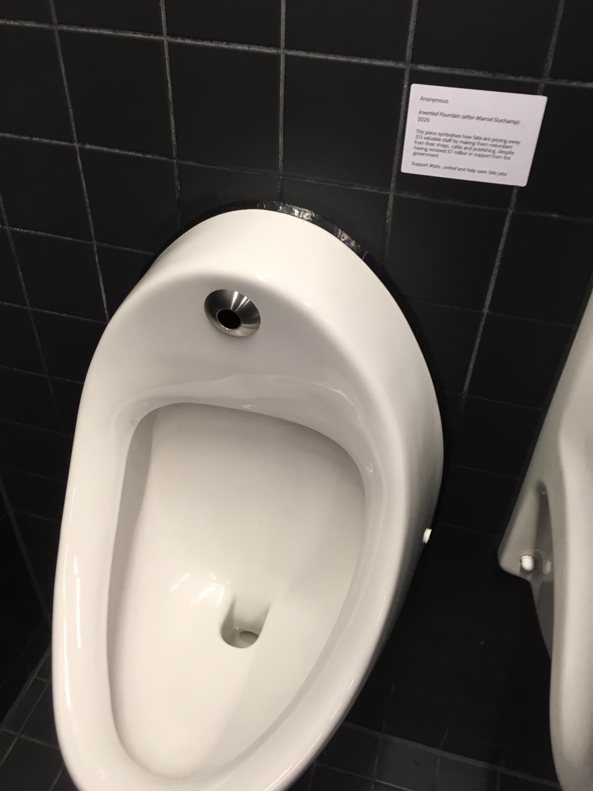 A parodic museum label next to the new Duchampian exhibit reads: “This piece symbolises how Tate are pissing away 313 valuable staff by making them redundant from their shops, cafes and publishing despite having received £7 million [∼$9.2 million] in support from the government.”