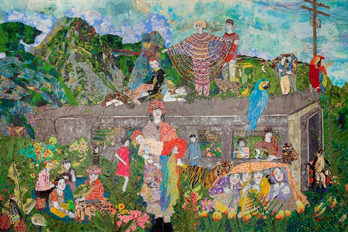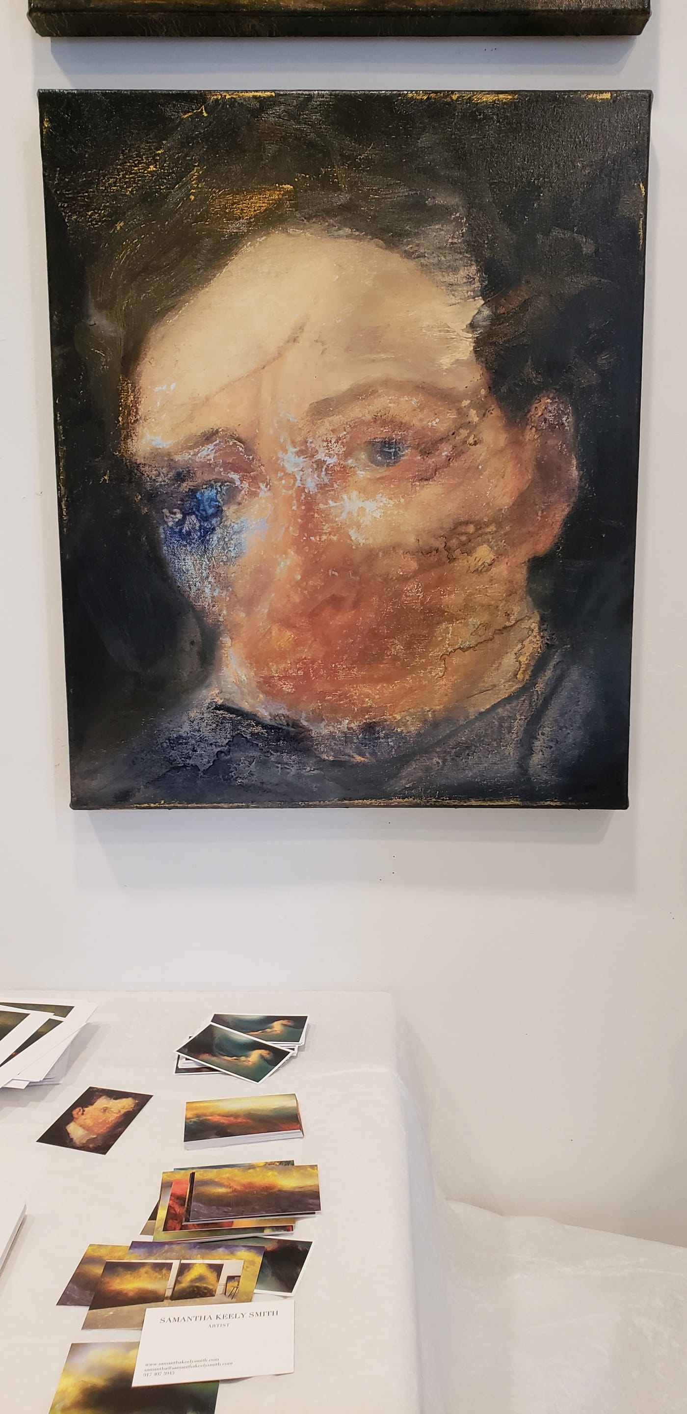Down the hall from Neptune, I ran into the painter Maria Berrio, who was only showing projected images of her work since the space was still working its way back from an unfortunate flood that had occurred months before. Berrio’s work is magpie, riotously colorful, with human figures almost always facing the viewer in a demeanor of watchful awareness. Her scenes mix the magical and the mundane is ways that are just riveting. Samantha Keely Smith at 68 Jay Street combined portraiture with her rambunctious fictional landscapes to create images of faces that teetered on the verge of dissolution.
