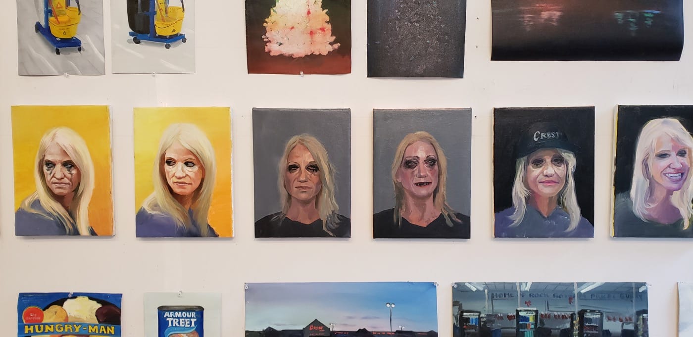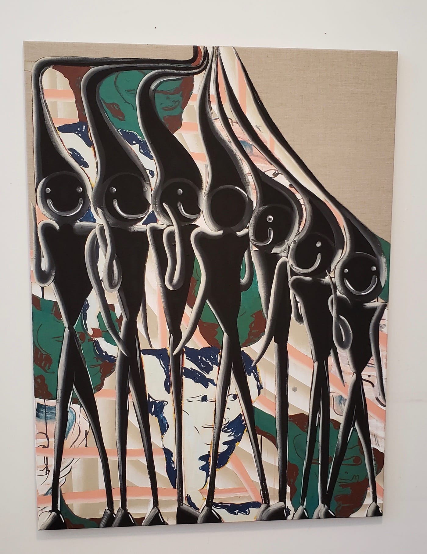 Among the artists I already knew, I was thoroughly delighted to run into several of them at Sharpe Walentas. Derek Fordjour, whose painting work with cheerleaders and professional athletes I’ve written about and continues to strike me as timely and insightfully conceived, was there. I was glad to meet Brandi Twilley for the first time, having written on her 2017 deeply felt show at Sargent’s Daughters. One of Twilley’s current projects is a series of portrait paintings of Kellyanne Conway, which depict this infamous counselor to the current president morphing into an increasingly wretched appearance. Lastly, I ended up at the studio of Narcissister, an artist whose reputation precedes by a good country mile. She makes work that is focused on the female body transgressing the implicit rules of women’s social comportment that aim to police clear distinctions between the genders. Her work is forceful and confrontational but also sexual in a way that stymies shame. In an image tacked onto her studio wall she says she uses for inspiration, a male doll has his head lost in a woman’s vagina, I also see the comic in her who wants to laugh at our silly, moribund patriarchal mores.