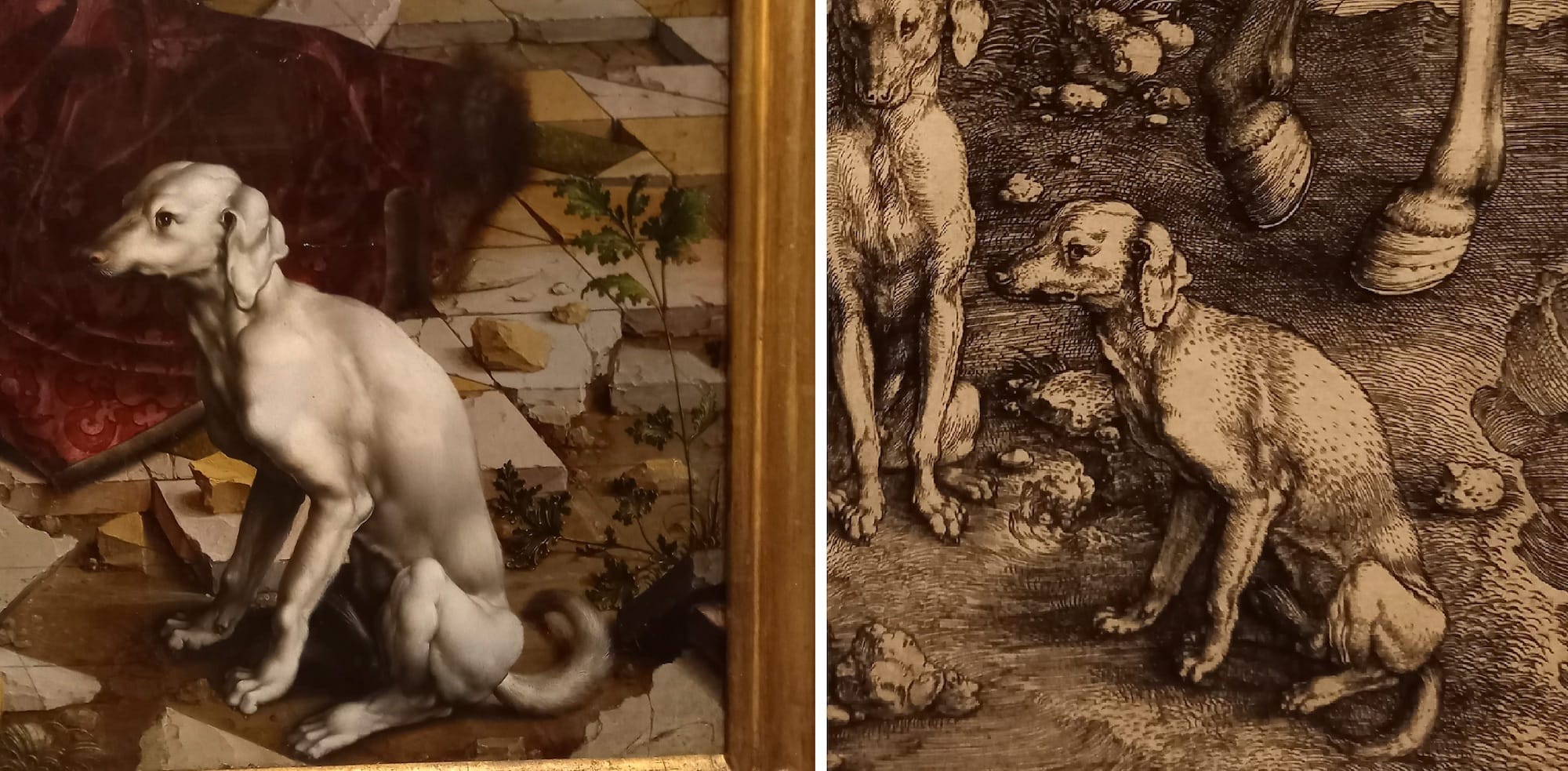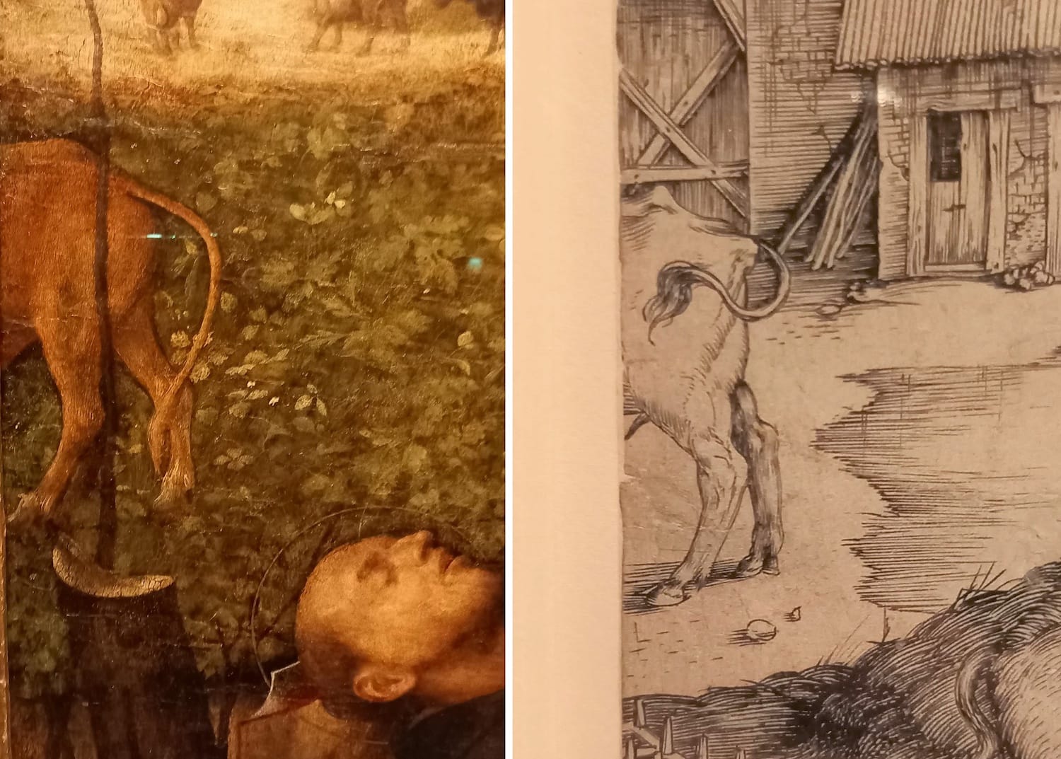 Where the curator does choose to make direct stylistic or iconographic links, however, these are largely convincing. We are informed that a dog in Dürer’s engraving of St. Eustace (c. 1499–1503, Rijksmuseum, Amsterdam) served as a model for works by other artists, such as the magnificent adjacent painting "The Adoration of the Kings" by Jan Gossaert (1510-15, National Gallery, London). The transportable and transmissible nature of paper-based engravings increases the possibility that the design at some point sat in front of Gossaert’s nose, but merely looking at the two sinewy canines’ identical pose and stylized musculature suffices. Foister even identifies the unusual motif of a bullock’s rump, seen truncated by the frame of Giovanni Bellini’s "Assassination of Saint Peter Martyr" (1505-57, National Gallery, London), as “identical” to a similar truncated rear in Dürer’s "Prodigal Son" (c. 1497, British Museum). (In this case, though, the different tail positions hint that the Bellini — and by extension the comparison — might be included because, conveniently, it normally lives two floors away in the Sainsbury wing, and didn’t require a loan.)