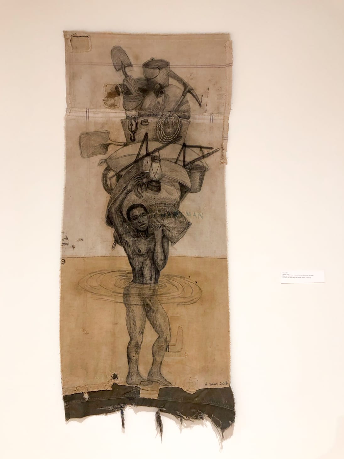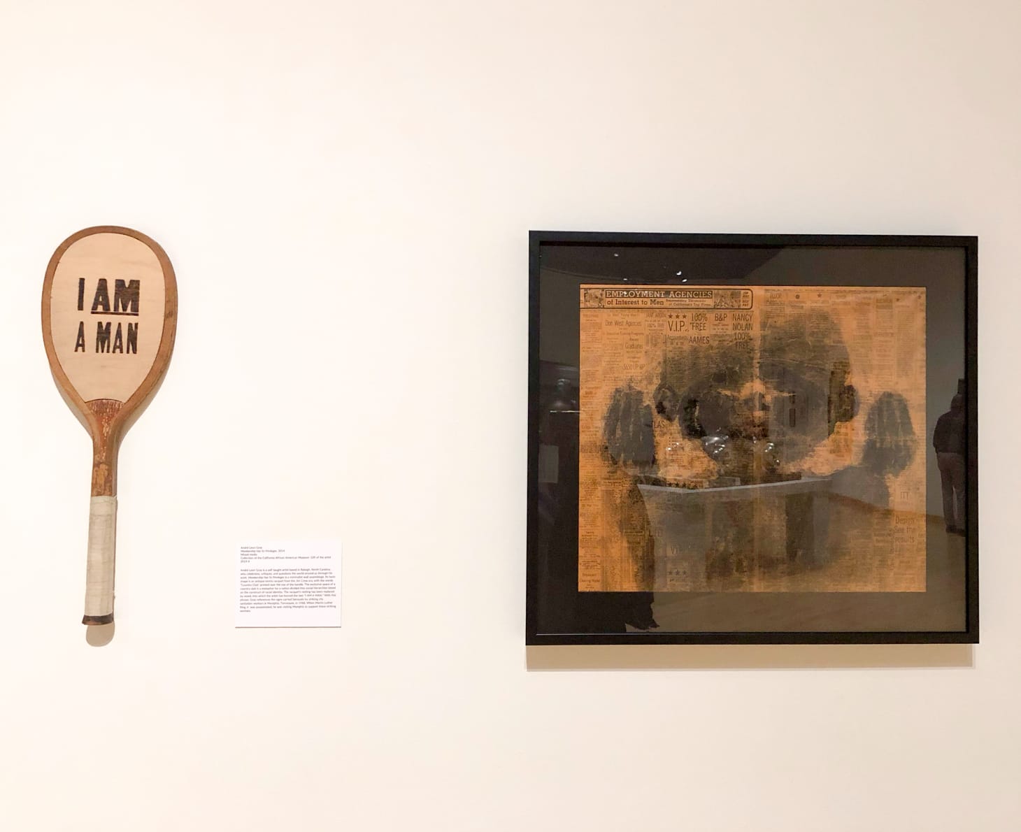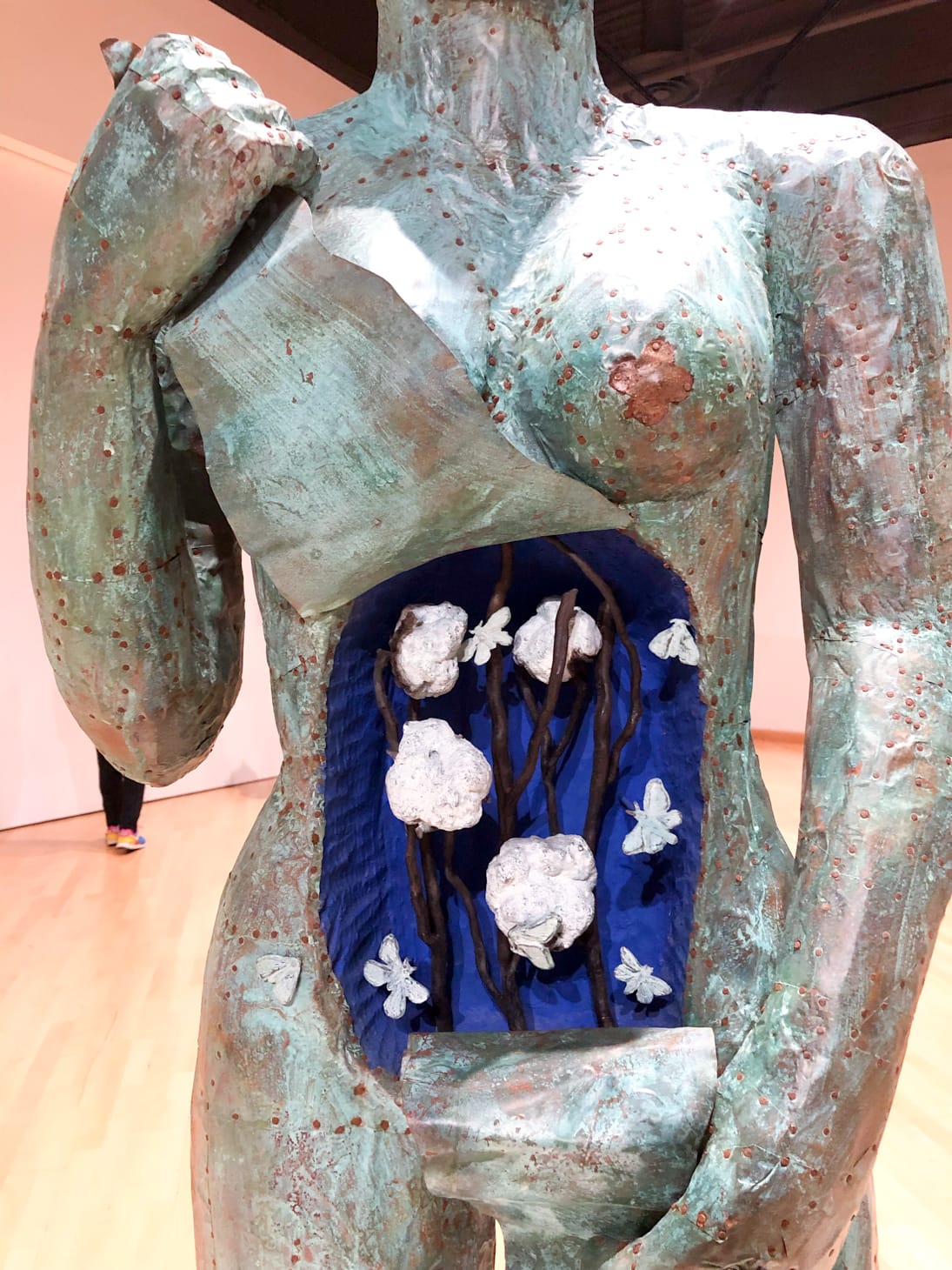 Standing tall and gorgeously assured on the gallery floor is Allison Saar’s divine female figure, “Foison” (2011), tearing herself open to reveal cotton and moths bounded within her indigo interior, symbolic of embedded generational trauma and memory of slavery, the agriculture central to American infrastructure and economics through the oft-forgotten labor of slaves.