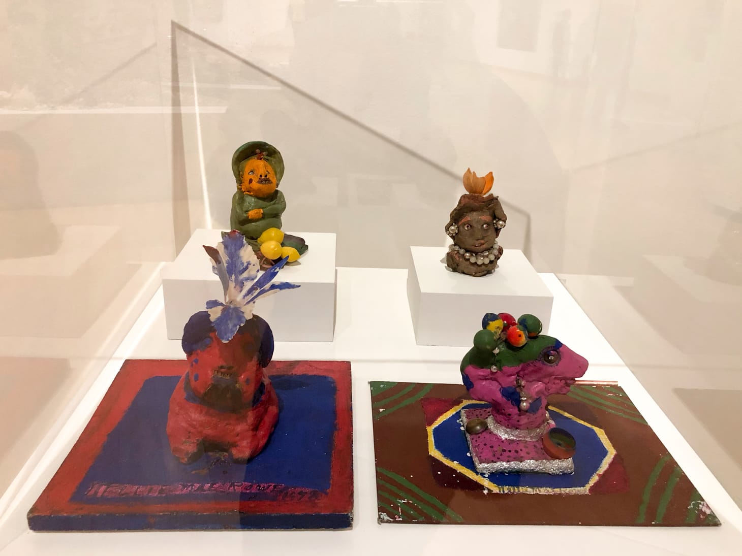 The narrow entrance to the exhibition is lined by folk paintings, precious and small, by artists like Purvis Young and Sam Doyle. Inside the gallery, a vitrine houses Nellie Mae Rowe’s statuettes made of chewing gum. A wall text explains the Georgian artist gave gum to the children in her neighborhood on one condition: they were to return the chewed wads when they were through. Simultaneously grotesque and whimsical, the miniatures made from the hardened candy, decorated with paint, buttons, and beads, offer absurd but quaint talismanic figurines.