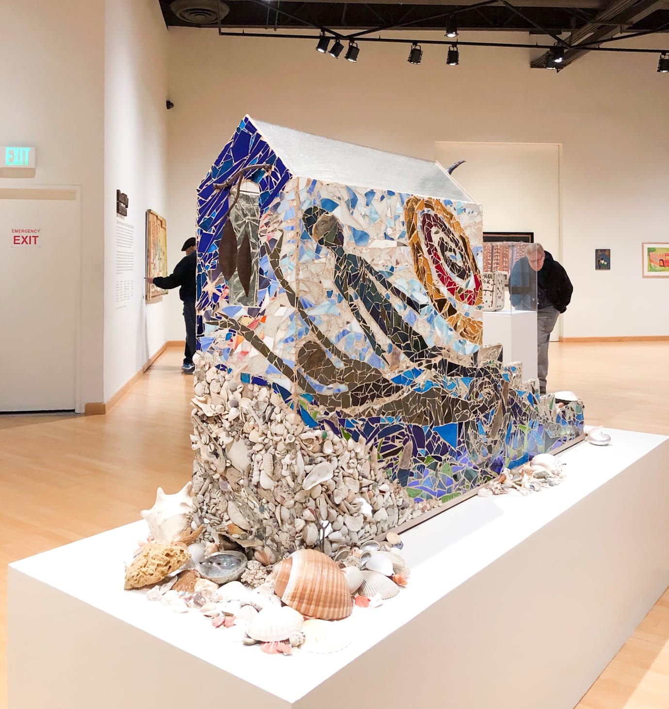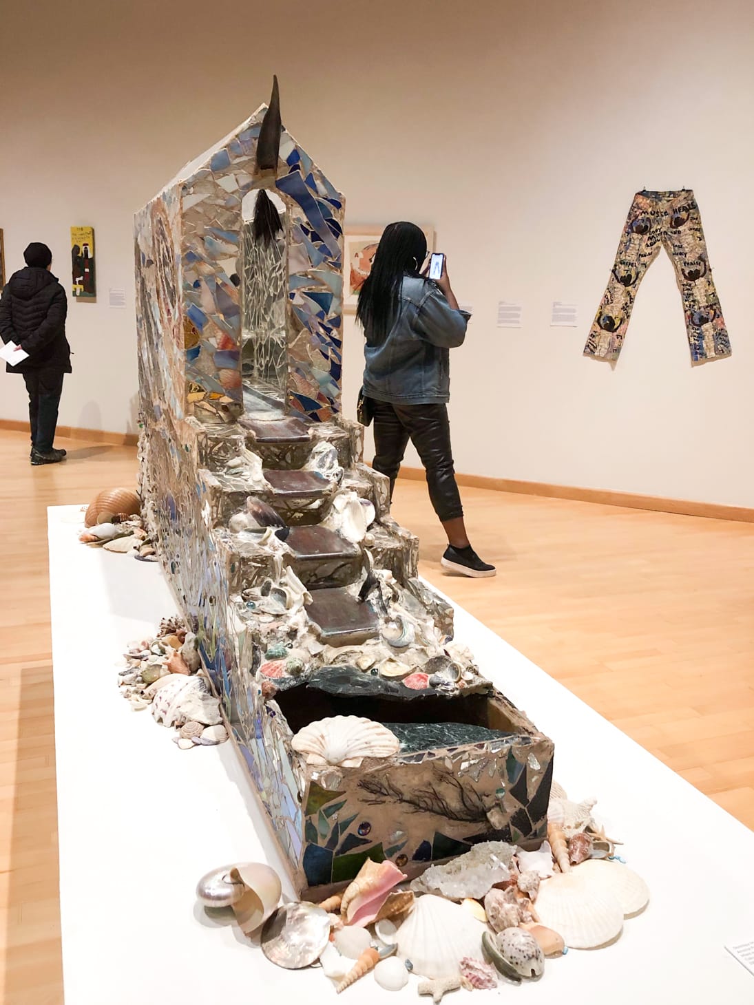 Southern Christianity and ancestral spirituality are also guiding themes in Dust My Broom. Dominique Moody’s striking, imposing shrine, “Ancestral Praise House,” pieces together natural materials — shells of all sorts and sizes, geodes, and seaweed — to recreate the prayer homes built and used by coastal Gullah women. She creates a mosaic out of salvaged mirror and stained glass from firebombed churches — shards fragmented by targeted racial violence — which form an interpretation of sea and sun, intertwined with silhouettes of ancestral spirits reaching toward the sky.