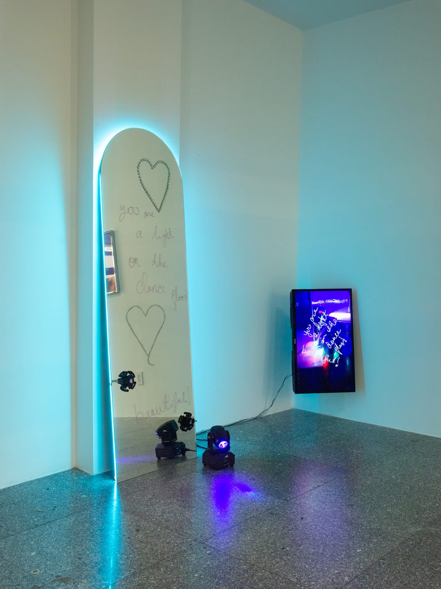 The current exhibition opens with a series of portraits by photographer Elliott Jerome Brown, Jr., which shows MHYSA dressed in her pop star finery. She smiles coyly at the camera, styled in a manner that recalls the fashions in 1990s gossip magazines. The glossiness of these photographs contrasts with the five-installment Vinyl Studies series (2021), a selection of collages featuring ephemera and album covers from musicians such as Sheila E. and Anne Peebles. The centerpiece of the altar and the flesh is You are a light on the dance floor! beautiful! (2021), an installation consisting of a floor-length mirror and a single-channel video. The grainy video records MHYSA mid-performance in what appears to be a fan’s Instagram story, singing and writhing to the beat as club lights flicker in the background. The mirror next to the screen is obscured by rhinestone heart decorations and the piece’s title is scrawled in child-like cursive. Together, the mirror and the video place the viewer in the position of the fan inspired by MHYSA; not only are we inspired by her grace and talent, but her visibility allows the viewer — particularly a Black femme viewer — to imagine a space in which they are the star.