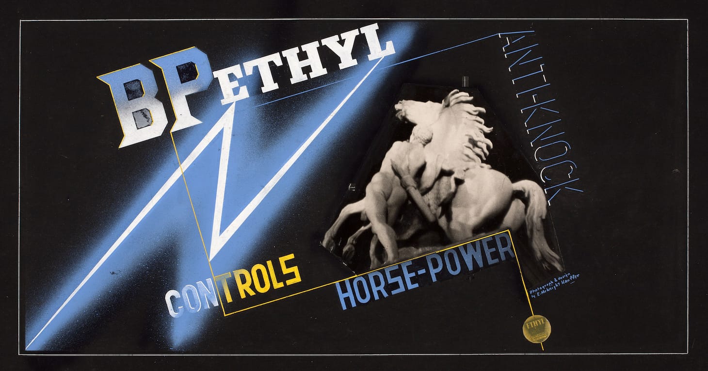In the early years of his career, Kauffer produced some designs for the oil company Shell-Mex and B.P. With the arrival of Jack Beddington, the company’s forward-thinking publicity manager, in 1928, that relationship flourished into one of his most significant collaborations. In exhibitions in London in the 1930s, Beddington presented the company’s advertisements, guidebooks, lorry bills, and posters in the context of fine art. Sir Kenneth Clark, director of the National Gallery and a close friend of Kauffer’s, wrote the introduction to the catalogue for Exhibition of Pictures in Advertising by Shell-Mex & B.P. Ltd., at Shell-Mex House, calling the company “among the best patrons of modern art” for the last seven or eight years. In New York in the 1940s, advertising executive Bernard Waldman tenaciously championed Kauffer’s talent, helping him to secure numerous commissions. Among the most significant was the American Airlines campaign, for which Kauffer produced more than thirty posters. Waldman, his wife, Marcella, and his daughter, Grace, became Kauffer’s adoptive family.