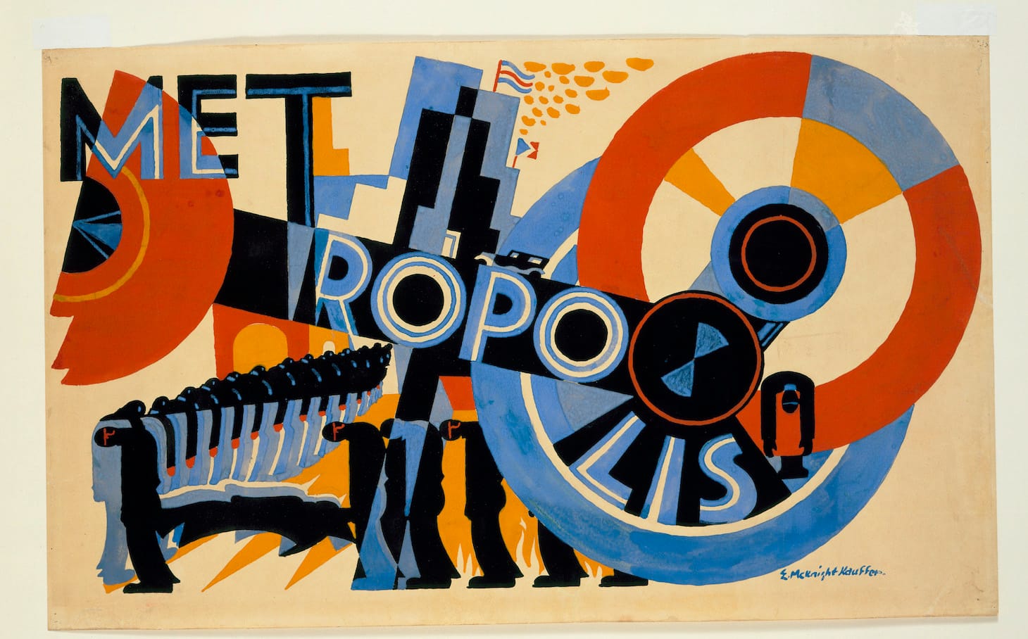 Not everyone was convinced, however, of the value that Kauffer’s sophisticated style could bring: in 1926, the film company Gainsborough Pictures rejected several of his poster designs. Kauffer was at the height of his celebrity at the time, and the slight made headlines: “Posters Too Good for the Films,” the papers reported. Both works had been designed to promote Alfred Hitchcock’s thriller The Lodger: A Story of the London Fog. “They are sort of Futurist and quite attractive,” a Gainsborough executive is quoted as saying, “but for one thing we did not want the public to think the film was one of these expressionist pictures like ‘Dr. Caligari.’” Despite the rejection of his posters, Kauffer remained involved in the project, ultimately designing the film’s titles. Another film poster Kauffer designed, Metropolis, was also never produced.