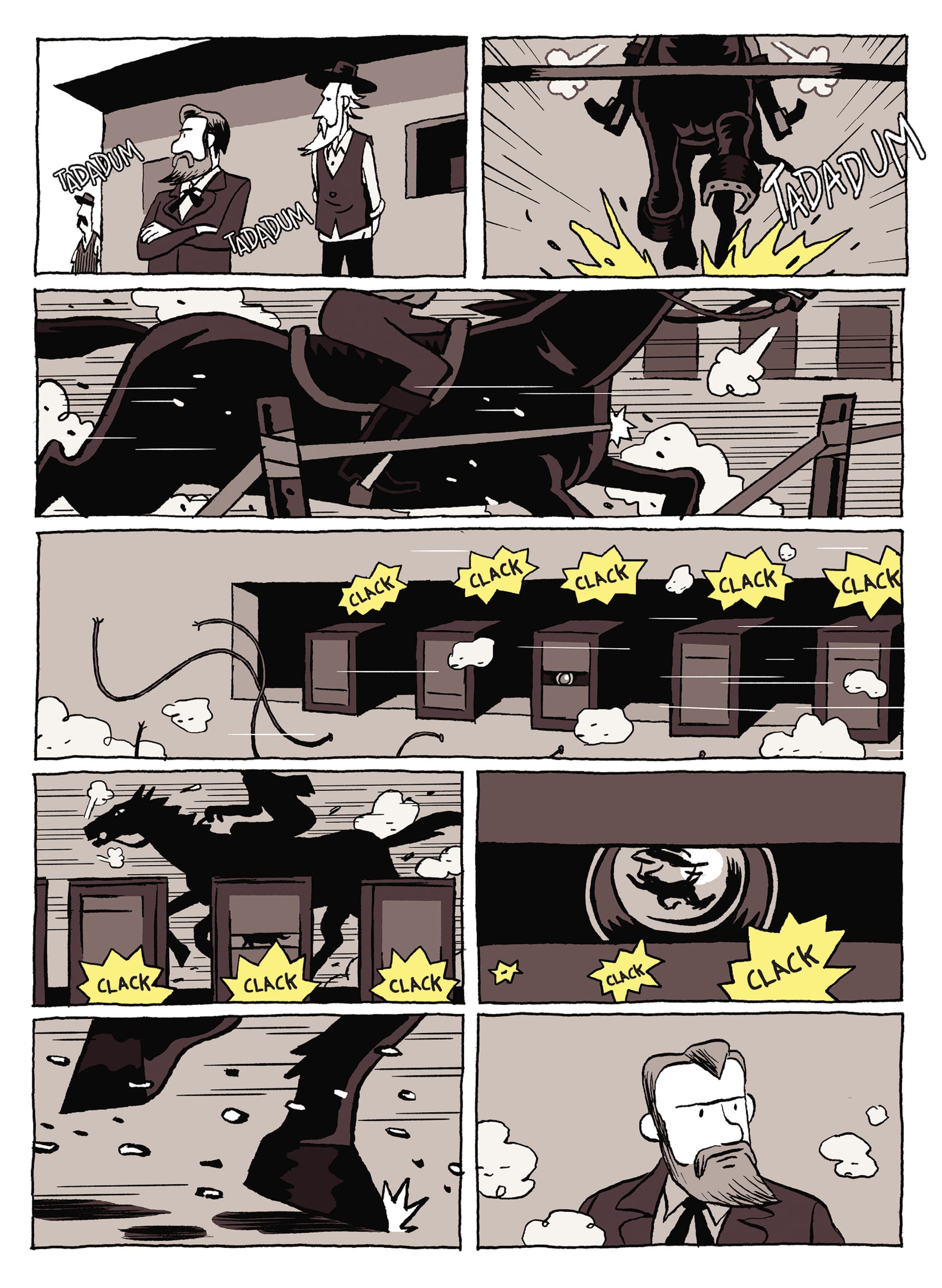 At several important moments in this comic book, like the murder or Muybridge’s death, Delisle invokes “slow motion” by imitating the style of the motion studies, breaking down the action into a series of images with minute differences. Arranging the panels alongside each other on the page — their respective images happening both sequentially and simultaneously — encourages the reader to consider each element of a scene, highlighting in particular the different ways that comics and cinema organize time.