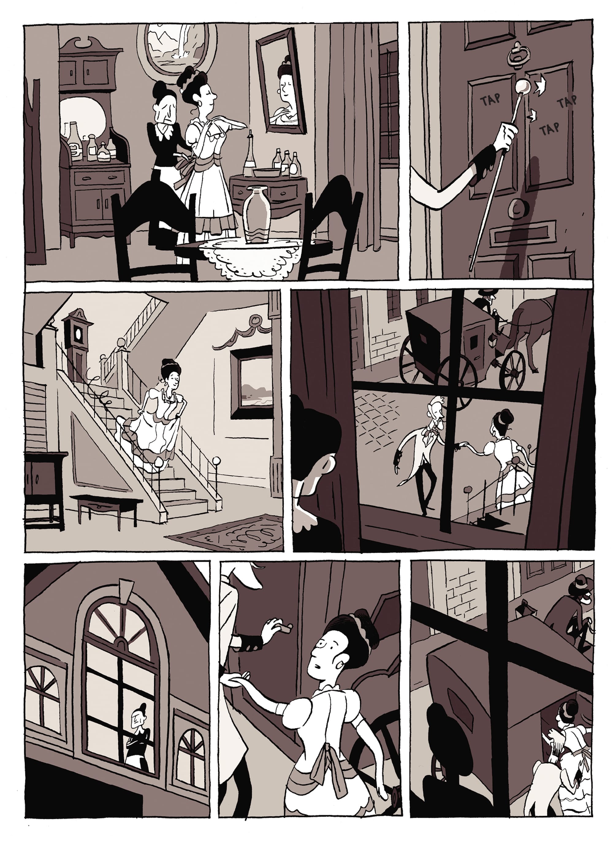 As the above might suggest, Muybridge is as much a social history of photography and its relationship to culture during the 19th century as it is one man’s life story. With cameos from the likes of Charles Baudelaire, Delisle explains how the ability to replicate life in prints affected everything from the art world, as some painters saw their craft threatened, to commercial interests, as the demand for photographs increased. Muybridge entered the business in this context in 1850s California, becoming well-known for documenting “frontier” regions like the West and Alaska, satisfying a market hunger for photography's perceived capacity to deliver the reality of far-flung places. Delisle’s cartoony style, however, removes any pretension of realism. It is occasionally interrupted by reprints of photos or motion studies, marking a stark divide between “everyday” life as rendered by the pen and life as rendered by the camera.