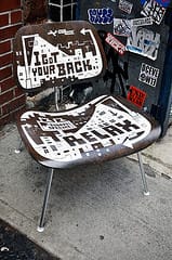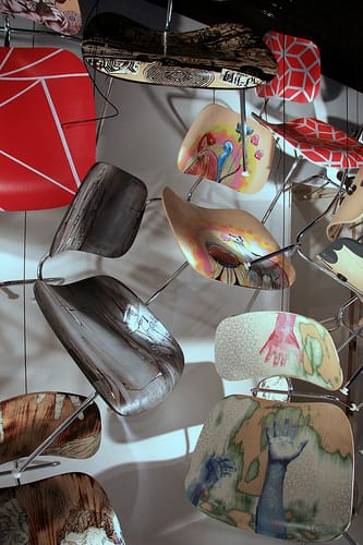 Having been a furniture designer in a past lifetime, I’ve always had the deepest respect and unwavering admiration for Ray and Charles Eames. Their work exemplified the perfect balance between form, function and the creative process. Merging their iconic molded plywood lounge chair with my latest passion, graffiti and street art, is a dream come true. I feel it completes a circle of sorts — and restores my confidence that worlds can collide in collaboration with clear and effective results. All of the participating artists took this project to heart and, in my view, delivered artwork beyond my wildest expectations. The collection is amazing as a whole, while each individual chair holds its distinct expression as an individual piece of art. Our success will be measured by the happy faces and wide-open eyes seen on pedestrians viewing honest to goodness graffiti and street art from a different kind of street level perspective.