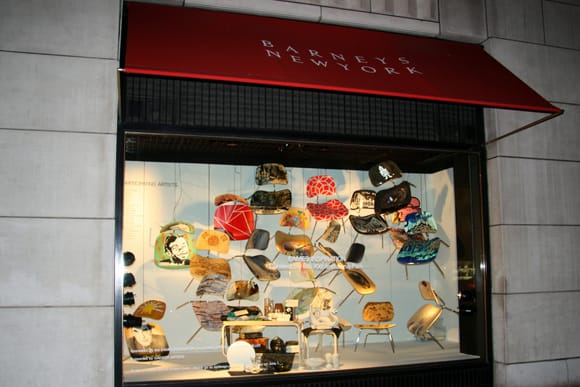 Yesterday, Barneys installed 20 Eames plywood chairs in one of their world famous Madison Avenue store windows but what made this display at the department store different was the mashup of a high modernist 20th C. design icon with the brash individual style of some of New York’s most active street art talents.