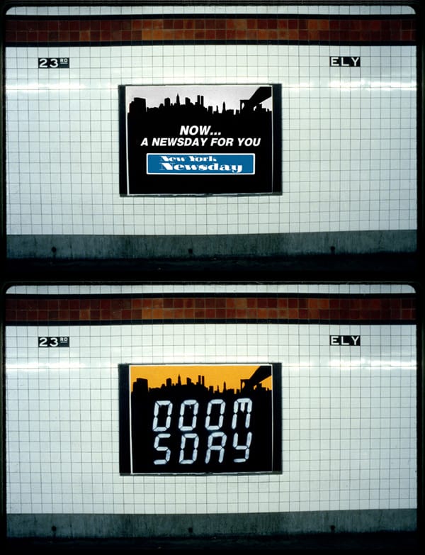 Artist John Fekner recently found this previously unpublished photograph of a subway billboard street art piece he created in 1983. He transformed a Newsday newspaper poster in the Ely/23rd Street subway station in Long Island City, Queens, into a more ominous scene under a yellow sky.