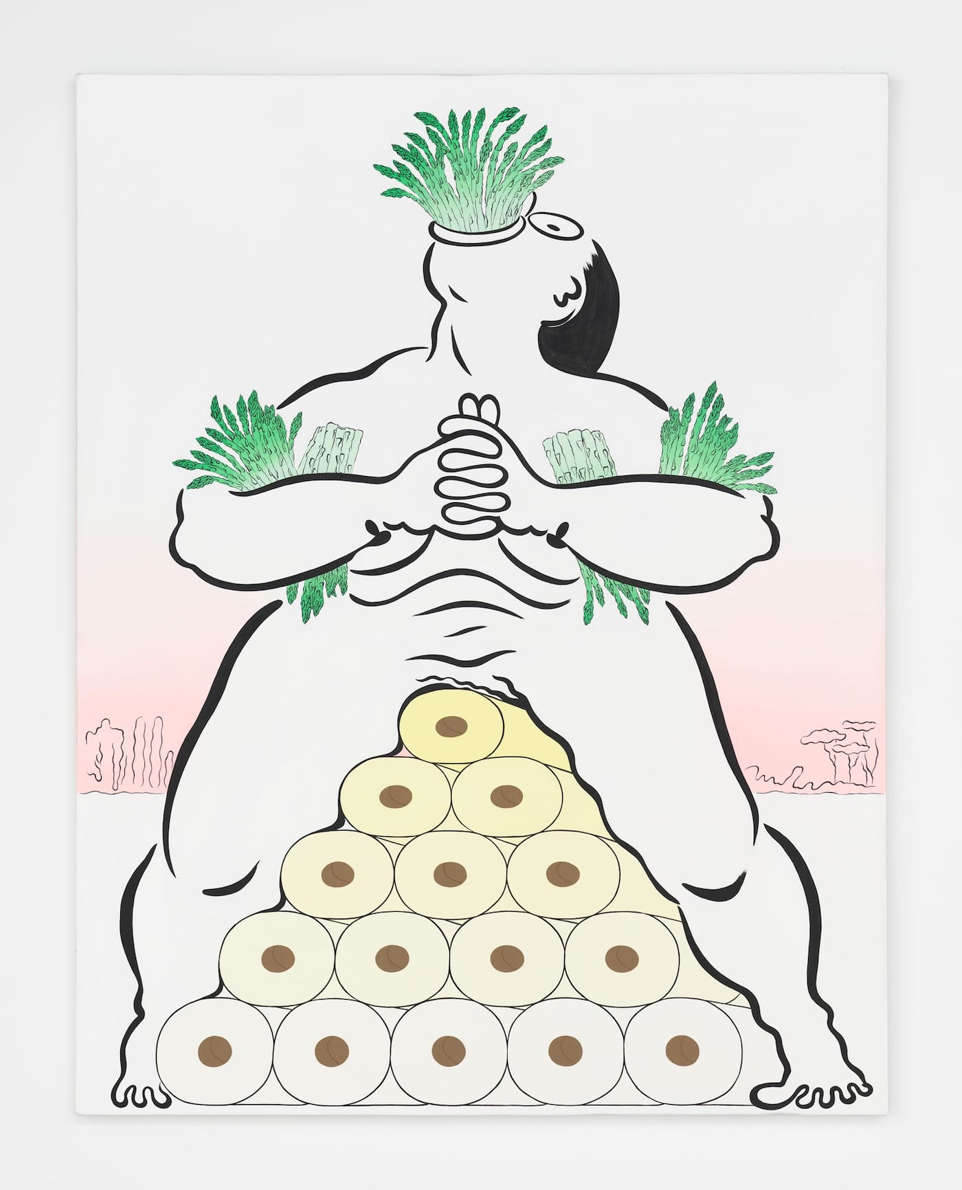In one of the large acrylic paintings, “Fatebe Aspargus Pee” (2017), Fatebe is squatting with legs apart upon a pyramidal stack of toilet paper. The roll at the top is a sickly yellow, which becomes lighter as it spreads downward through the tiered toilet paper, though the bottom row remains pure white, apparently spared by Fatebe’s pee. Meanwhile, she is clasping her hands together and holding a bunch of asparagus stalks in the crook of each elbow. Another two bunches are tucked between her forearms and her breasts. Finally, Fatebe flings back her head, her open mouth crammed with more than a dozen asparagus stalks, as if her mouth were a vase. Muslimova’s riff on the trope of woman as vessel is a perverse celebration of olfactory delight.