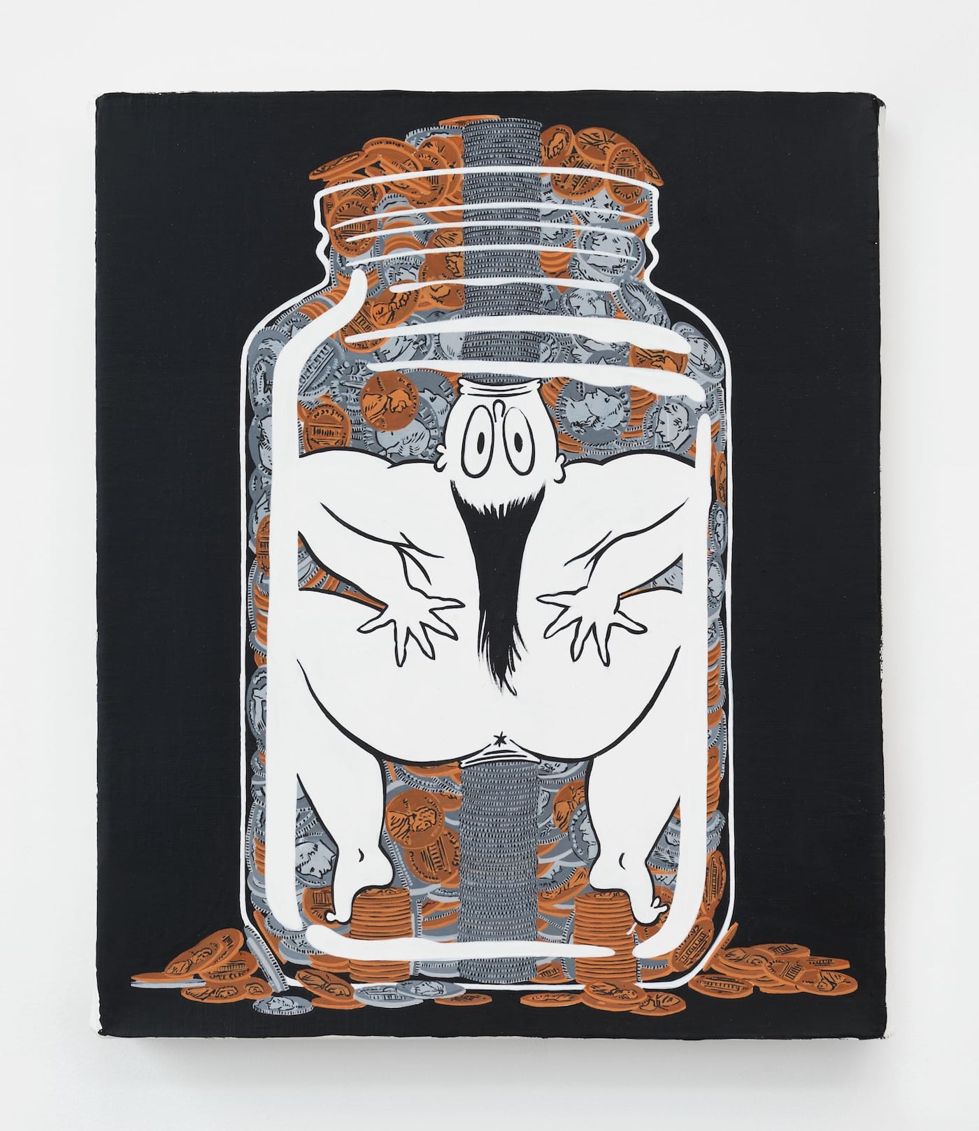The small, largely black painting, “Untitled (Jar)” (2017), shows Fatebe stuck inside a white, outlined jar, her flattened white body resembling an overhead view of a frog. With her two big elliptical cartoon eyes upside-down and staring directly at the viewer, perplexed, she is squashed against the glass by the contents of the jar, a trove of gray and copper-colored coins, from quarters to pennies. A column of gray coins descends unimpeded from above the overflowing rim of the jar into Fatebe’s open, upturned mouth and out of her stretched-open vagina.
