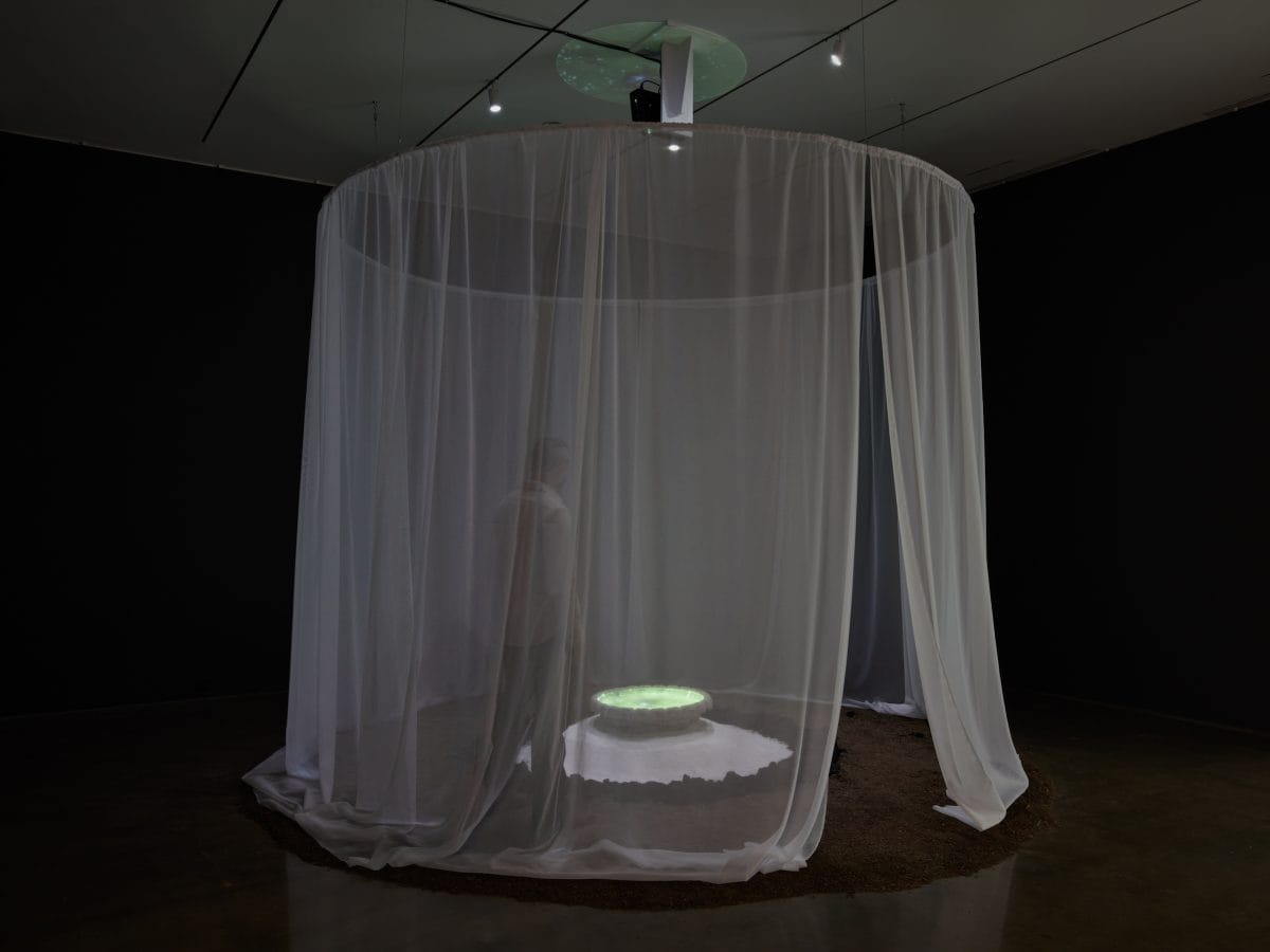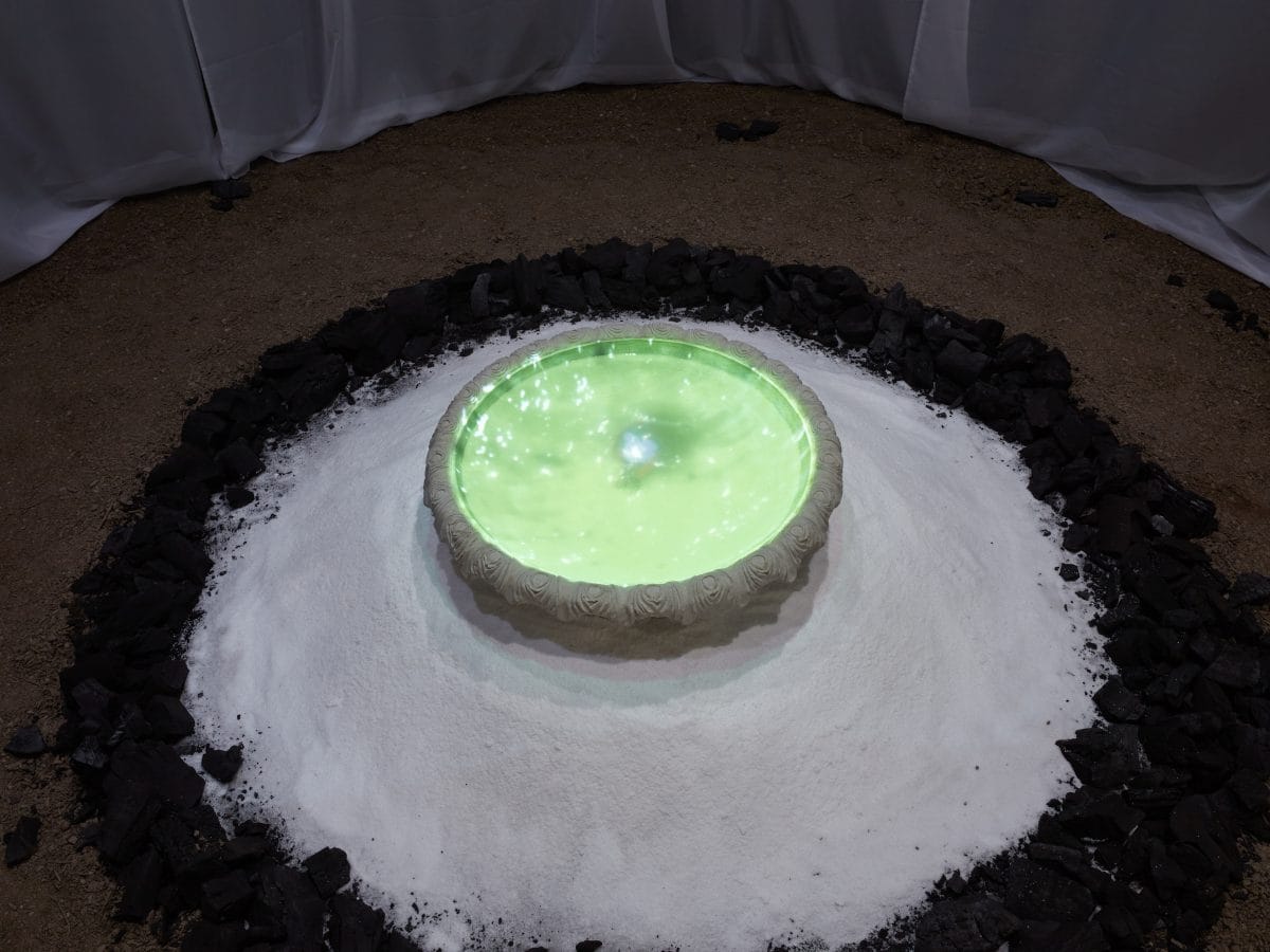 Curated by Bernardo Mosqueira at the Hessel Museum of Art, Eclipse includes the titular, site-specific 2021 work alongside six moving image works produced by the artist from 2018 to 2020, each of which is available to stream online throughout the duration of the exhibition. Brasiliero grounds her performance-based work in her practice of Candomblé. Consistently, she marries repetitive bodily movements with richly textured soundscapes to rupture the barriers that divide tangible and intangible spheres of being. As I enter the intimate gallery of “Eclipse” (2021), I am transfixed by Brasileiro’s hushed vocals which emanate tenderly from above. At the center of the dim gallery, a stone basin filled with water sits atop a mound of salt, encircled by a ring of charcoal and shrouded by a thin, cloth veil. Together, these organic materials are charged with spiritual power and Brasileiro, using them as metaphysical conduits, deploys her body as a medium from which to explore manifold states of existence.