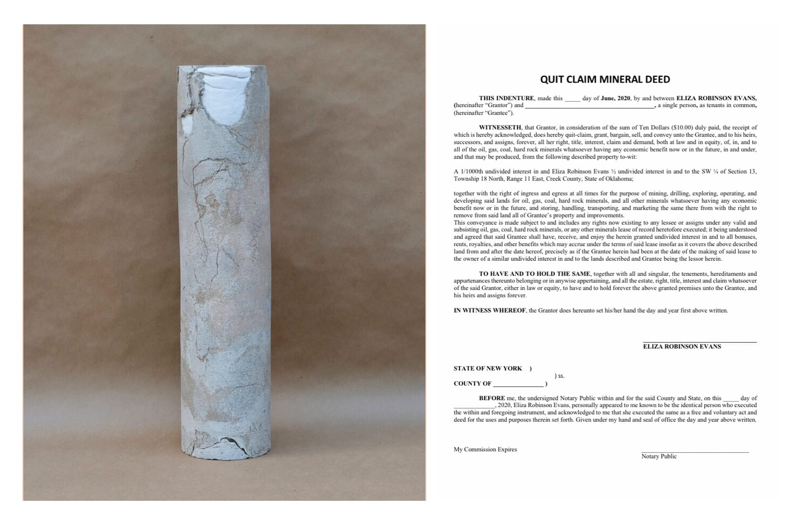 Ecofeminist art can challenge law and public policy, but it can also beat such systems at their own rules. Made in defense of mineral rights, Eliza Evans’s inventive “All The Way To Hell” (2020) is surely a thorn in oil and gas developers’ sides. The work is presented as a framed contract alongside a vertical stack of wall-mounted cylinders made from minerals. Evans inherited three acres of land in Oklahoma and when developers expressed interest in her mineral-rich property, she sought to protect it by drafting a contract that fragmented the land into $10 slivers to be sold to 1,000 people. Divvying up the property rights made it financially and bureaucratically more difficult for developers to mine, drill, and otherwise develop the land. The participatory piece is ongoing, with land available for sale.