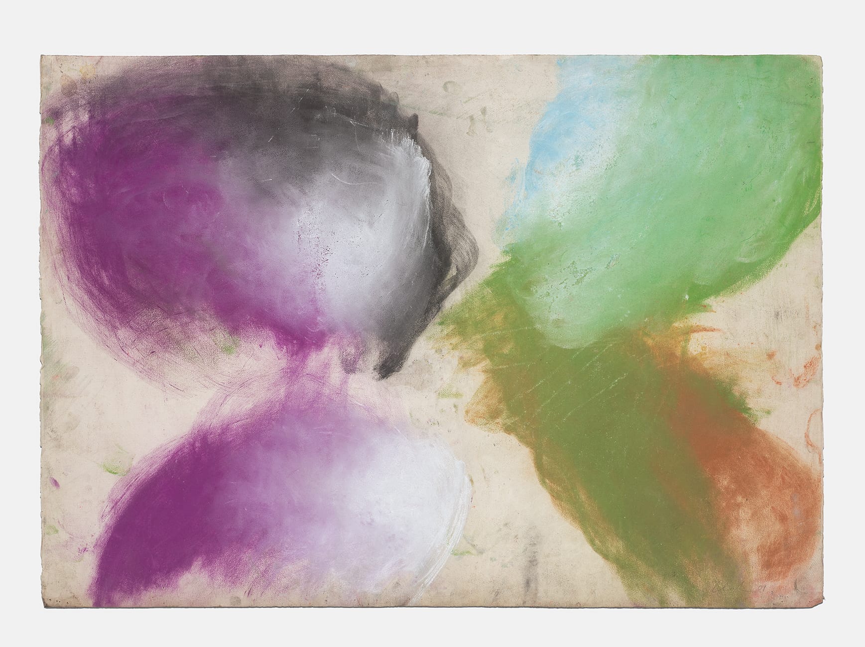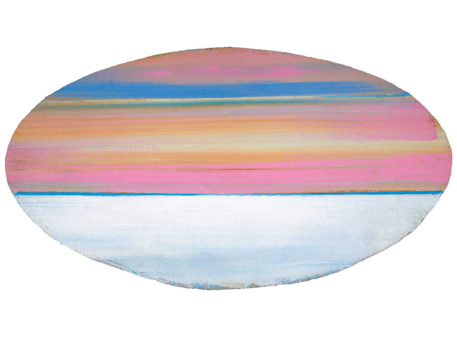 In “Untitled” (1974-75), Clark defines an oval inside the painting’s rectangular format by laying down a thin strip of tape to outline the oval. He has also laid down rows of horizontal strips that run the length of the painting. Unless you are standing close to the painting’s surface when you photograph it, none of this is visible in a reproduction. After he has prepared the surface, he uses a broom to push the cream-like acrylic paint evenly across the surface, from one side to the other. The grooves made by broom and the colors inside the oval do not completely match up with the markings on the outside. There are also the lines made by the tape strips that have been painted over, and the grooves where he has peeled the tape off, which is especially noticeable as it coincides with the oval’s circumference.