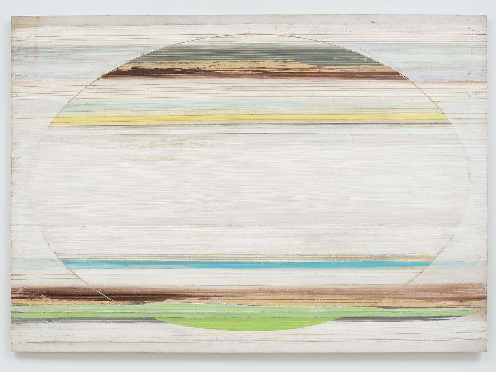 The shape of the oval, in tandem with the many shifts that take place between the inside and outside, reminded me of “The False Mirror” (1929), René Magritte’s painting of an enormous eye that nearly fills the picture plane. Clark’s oval is an abstract eye or stand-in for a lens. It brings what it sees into a stronger focus. At the same time, the ridged surface imbues the painting with a structural physicality. The cluster of rows reminded me of musical scales.
