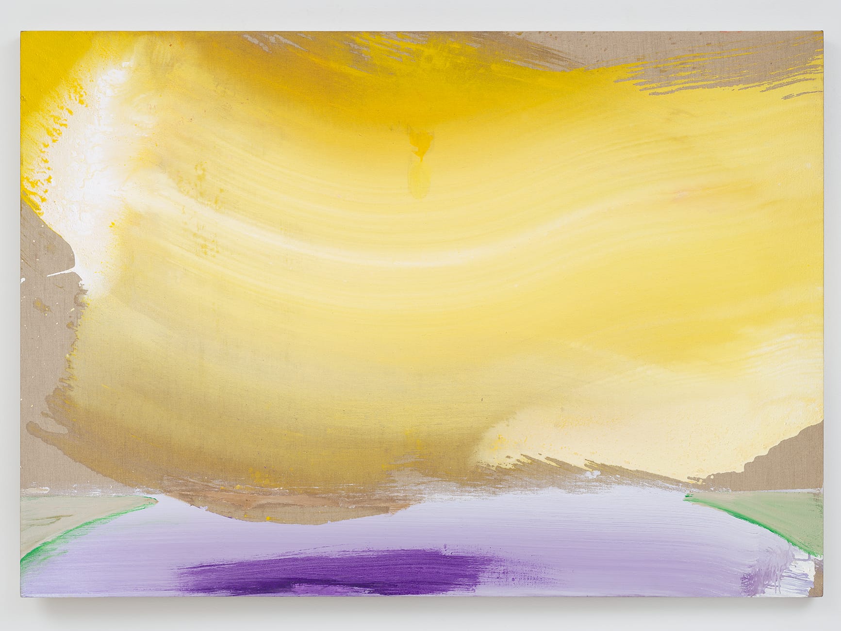 I began thinking about some of these issues when I went to the exhibition, Ed Clark: A Survey at Mnuchin Gallery, which includes a number of paintings made with a broom. It has long been repeated that when Clark began using a broom and painting on the floor, he was restating Jackson Pollock. If the unstretched oval painting, “Intarsia” (1970), which is 10 feet wide and more than 18 feet high, is any indication, he has mastered laying down the acrylic paint in what appears to be single strokes of varying widths. These grooved, unbroken strokes can be layered, one color atop another. We are looking at paint as paint, as well as paint as color and light, earth and sky. The artist, who enlisted in the US Air Force in World War II, neither flew nor saw combat, but he wanted to be a pilot.