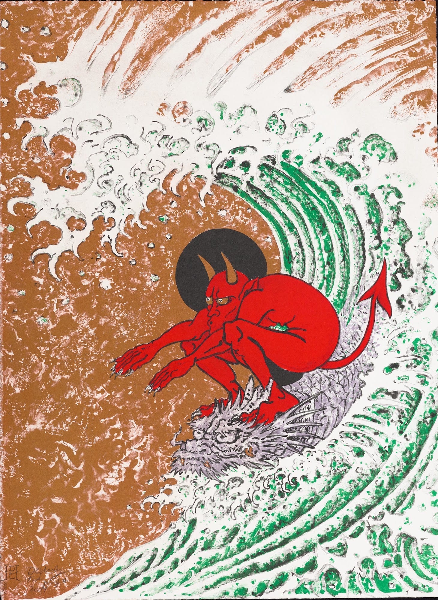 In 1973 — six years after his pivotal meeting with Samuel Stewart — Hardy became the first American to study tattooing with Japanese master Horihide in a small town in Japan. Then, when he came back after five months, he opened Realistic Tattoo, the first studio in the country offering custom tattoos. An adjacent gallery at the de Young features prints, drawings, and paintings with the themes that Hardy drew on for his tattoos, including tigers, panthers, skeletons, skulls, and a little red devil.