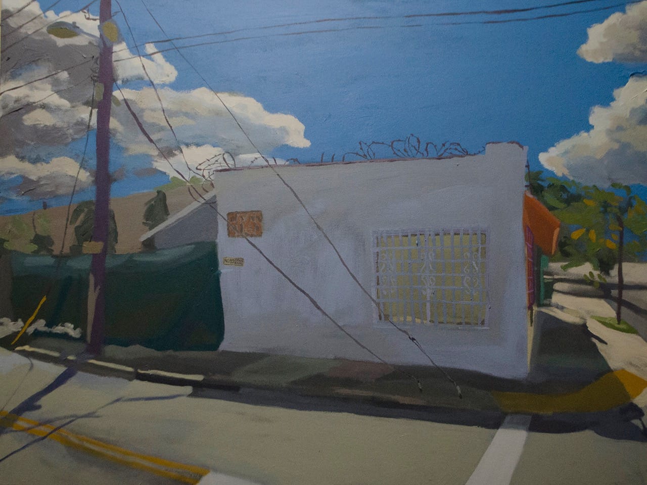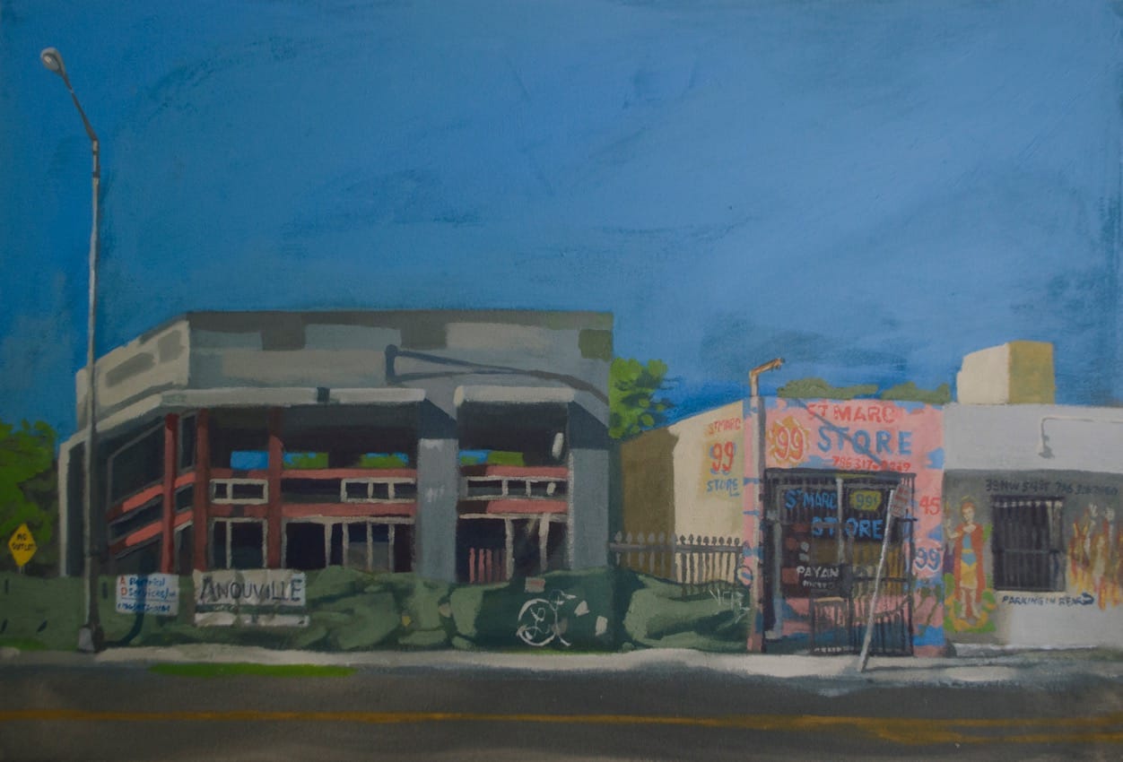 Arroyo is also deeply involved in activism in his Miami neighborhood, Little Haiti. He frequently paints its architecture, which is rapidly changing with rampant real estate development. The Whitney Biennial website describes his work as reminiscent of Edward Hopper; his spare portrayals of deserted buildings and his somber colors certainly evoke a Hopper-esque quiet loneliness. But Arroyo decidedly updates the genre of American landscape painting, capturing the flux of contemporary urban landscapes. He explained to Hyperallergic that landscapes paintings are traditionally “relegated mostly to souvenirs for tourists, mostly appreciated as posters or postcards in gift shops. Miami is seen through this lens. … I found it to be an appropriate platform to speak about my curiosities and concerns.”