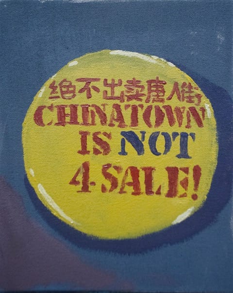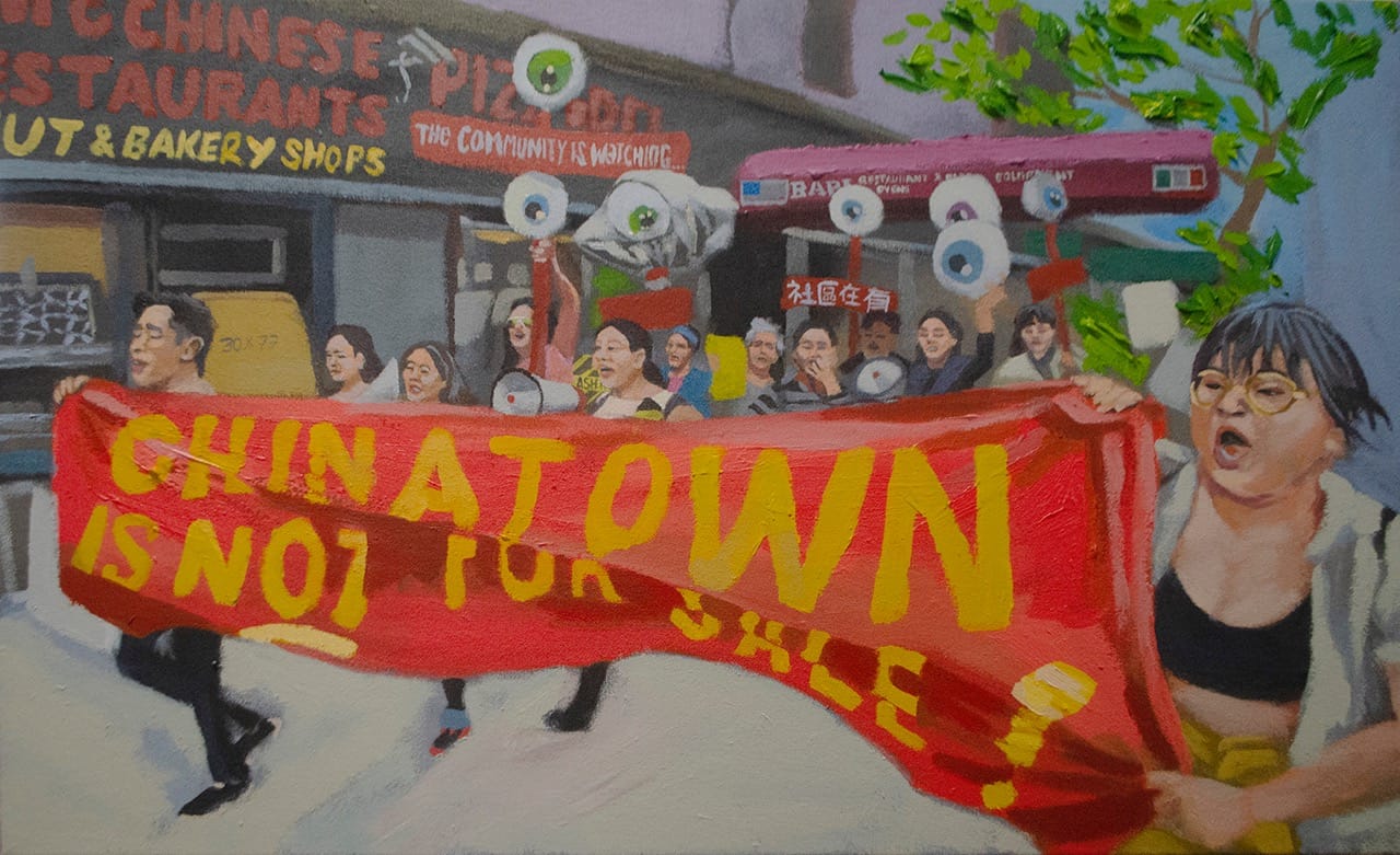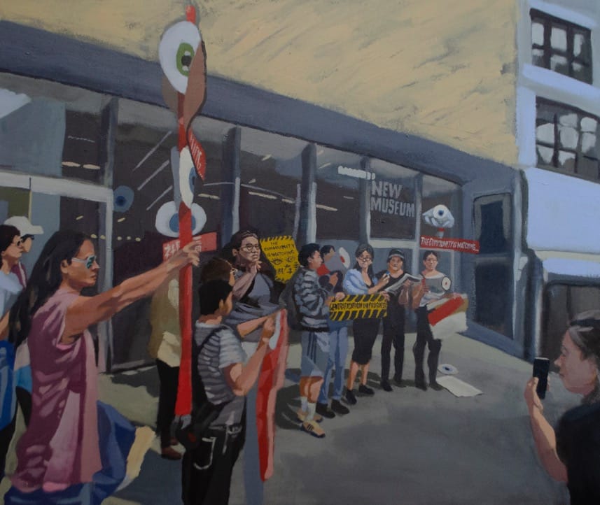 Arroyo reimagines the tradition of history painting with his political subjects; rather than powerful figures or famous battles, he depicts ordinary people. A recent painting series records protests he attended in New York on May 17, 2019, in Chinatown, and at the New Museum and Whitney Museum. This day of action, which coincided with the public opening of the Whitney Biennial, was meant to draw attention to art institutions’ complicity in the gentrification of Chinatown and downtown New York City and to continue protests against then-Whitney Board Vice-Chair Warren B. Kanders. Safariland, Kanders’s company, manufactures weaponry and tear gas. Five days after Arroyo and the other artists requested their works be withdrawn from the Biennial, the protests culminated with Kanders resigning from the Whitney’s Board. The eight artists subsequently chose to leave their work on view.