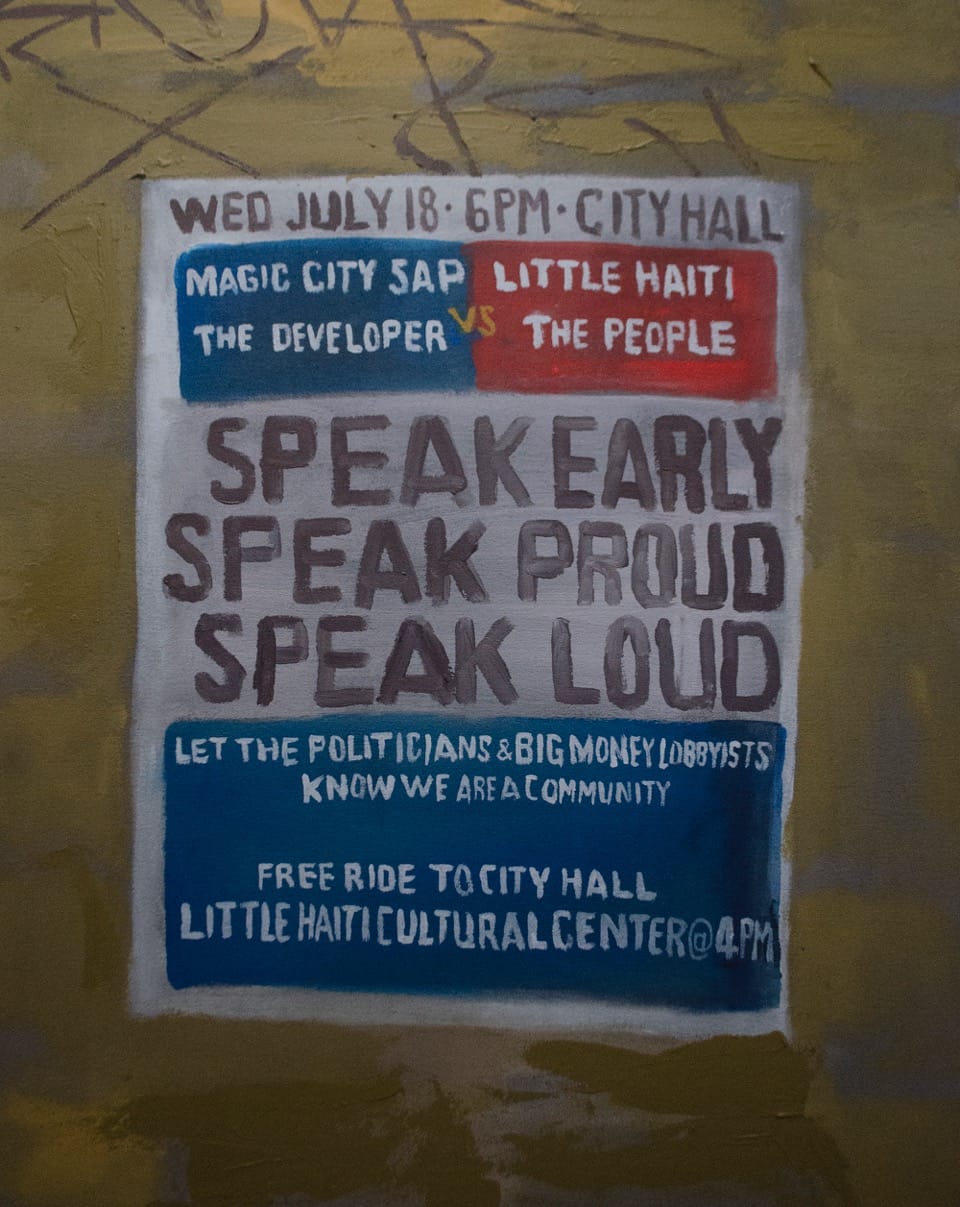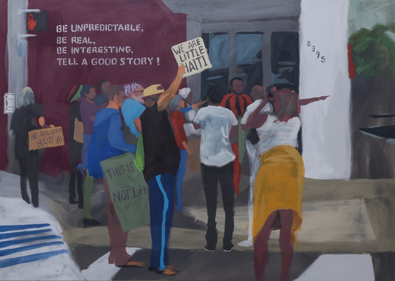 On how his artistic practice and political work are interconnected, he stated, “As the work unfolded, I began to ask the question, ‘Who do the paintings speak with?’ Community outreach became an important component. Activist organizations are vital because their mission is to speak with, [and] many times for, an existing neighborhood.” He noted that recent decisions in his neighborhood have not favored the protection of existing residents: “On June 27th, rezoning approval passed for the biggest mega-development project in Little Haiti, the Magic City Innovation District. This approval will encourage other global investors. There is an ongoing ‘Not for Sale’ movement in many metropolitan cities around the world.” He concluded, “Time will tell if and how it grows….”