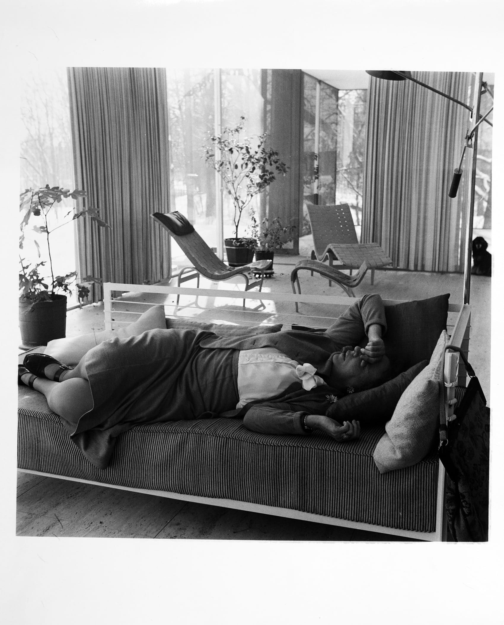 I found myself deeply interested in Wendl’s embodied visual interpretations of Farnsworth’s life, artworks in themselves. In her photograph titled “I Listened” (2017), Wendl portrays herself in the glass house, “breathing in and out death” while lying on a bed that served as a stand-in for Farnsworth’s own (the house had been staged for public tours). The image plays on ambiguity and visibility: blue disposable shoe covers, a conservative 1940s black dress, the mattress conforming to the weight of Wendl’s body that is visible only from the knees down, hands clasped on her belly, the curtains drawn just so, the entire composition viewed through a glass wall.