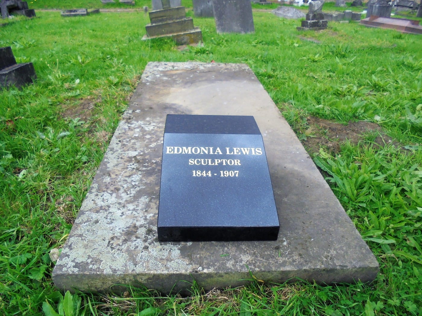 Today, grave C350 is newly distinguished. Now, on black marble, a woman’s name is picked out in gold letters: “Edmonia Lewis, Sculptor, 1844-1907.”