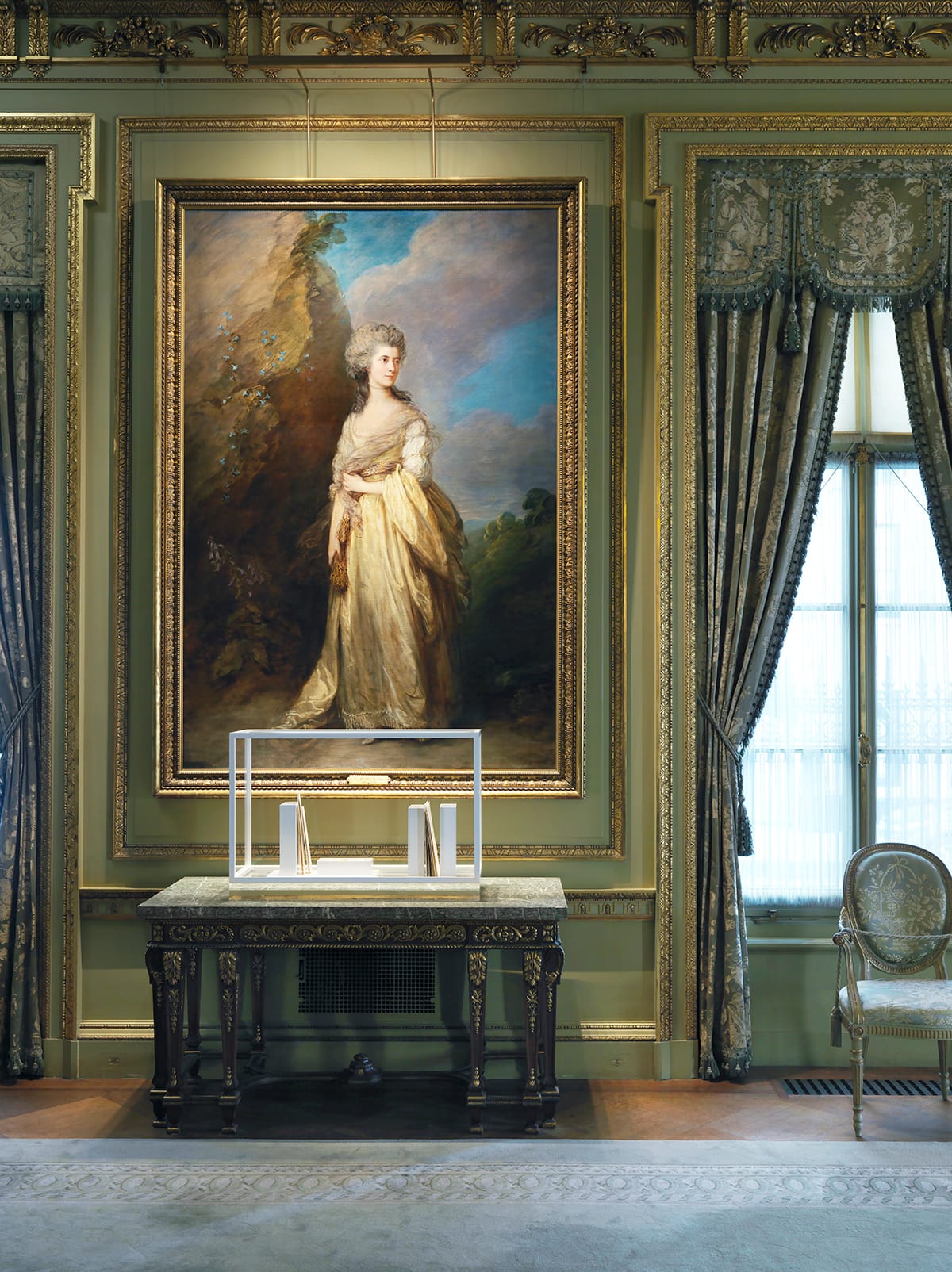 In the guide, De Waal describes the Frick Collection’s dining room as “a fantasy of the English country house.” His two works for this room, “on living in an old country I–II” (both 2019) are placed in conversation with a pair of late-18th-century Thomas Gainsborough portraits that depict two British noblewomen against countryside backdrops. In glass vitrines de Waal has placed steel receptacles and fragments of poetry etched on broken porcelain. De Waal muses that these pieces are about, “My response to Englishness … when I think about being English I want to break things.” While porcelain shards might suggest anarchy to the artist, to a viewer they are actually quite pleasing to the eye — delicate pieces encased on three sides by a clean steel box. This attempted subversion of English propriety, class, and nobility is a gesture too small to hold its own in the room.