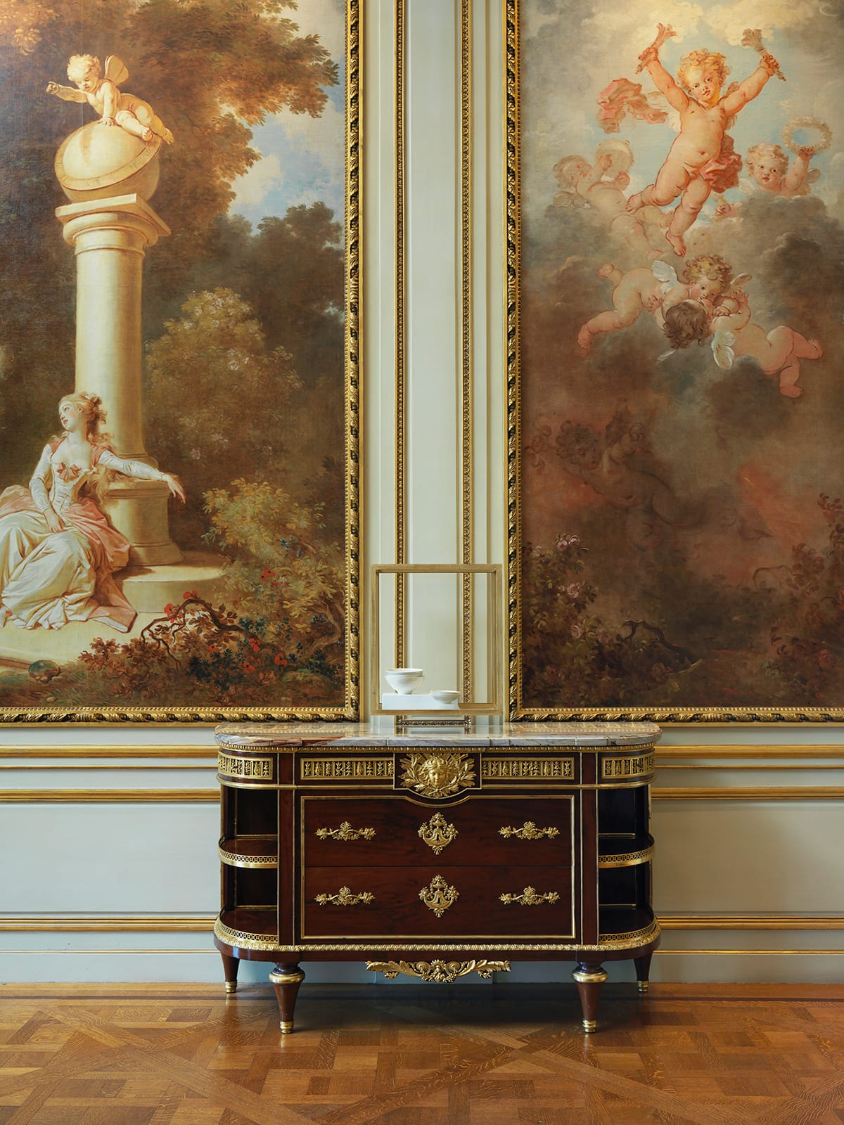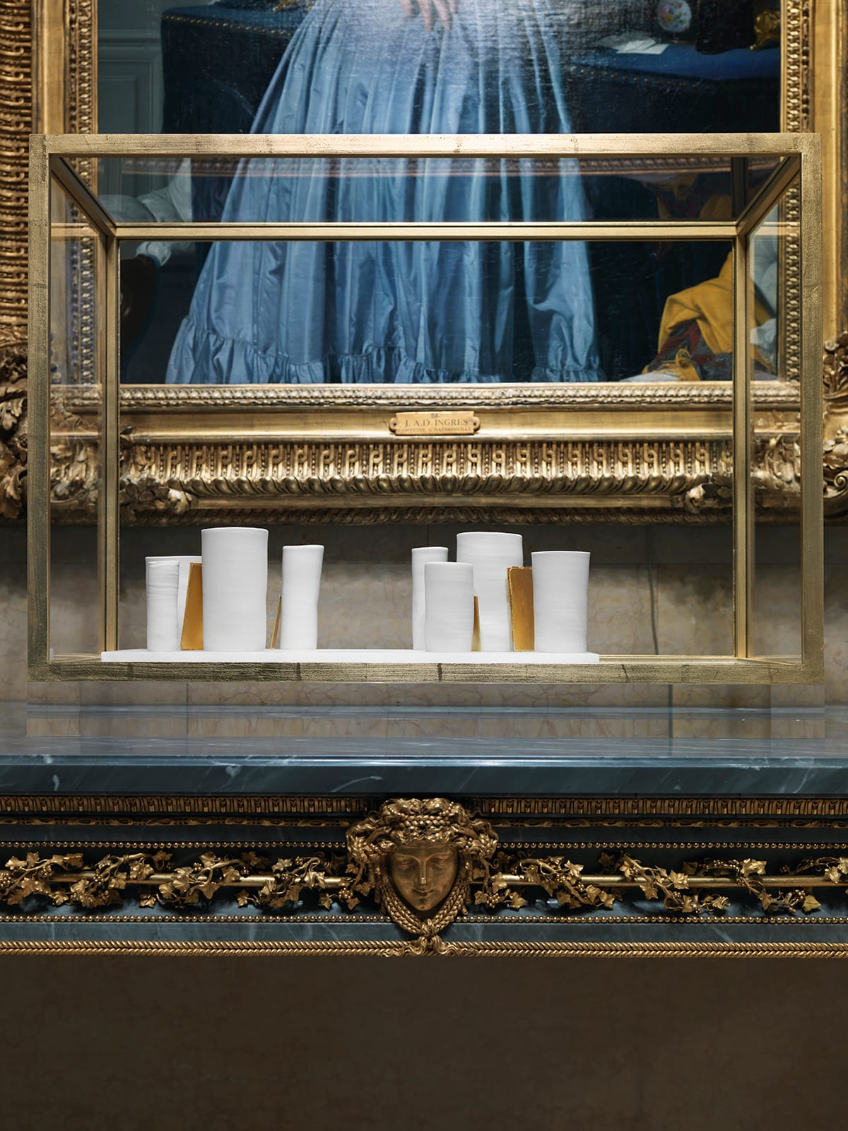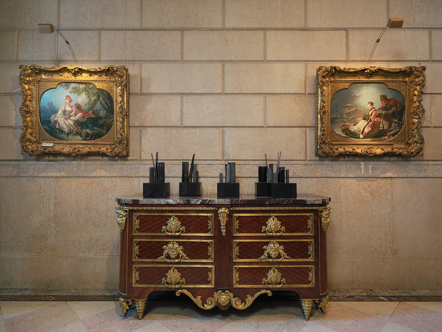 Fortunately many of de Waal’s other interventions come off much more successfully. In the Fragonard Room “on an archaic torso of Apollo” (2019) contains two sets of small, stacked porcelain bowls; their nesting evokes love and passion. This piece is difficult to find, its golden frame blending into the backdrop of gilded furniture. De Waal notes that, “it should be here and yet completely fugitive.” The viewer’s act of seeking fits perfectly with Fragonard’s scenes of courtship.