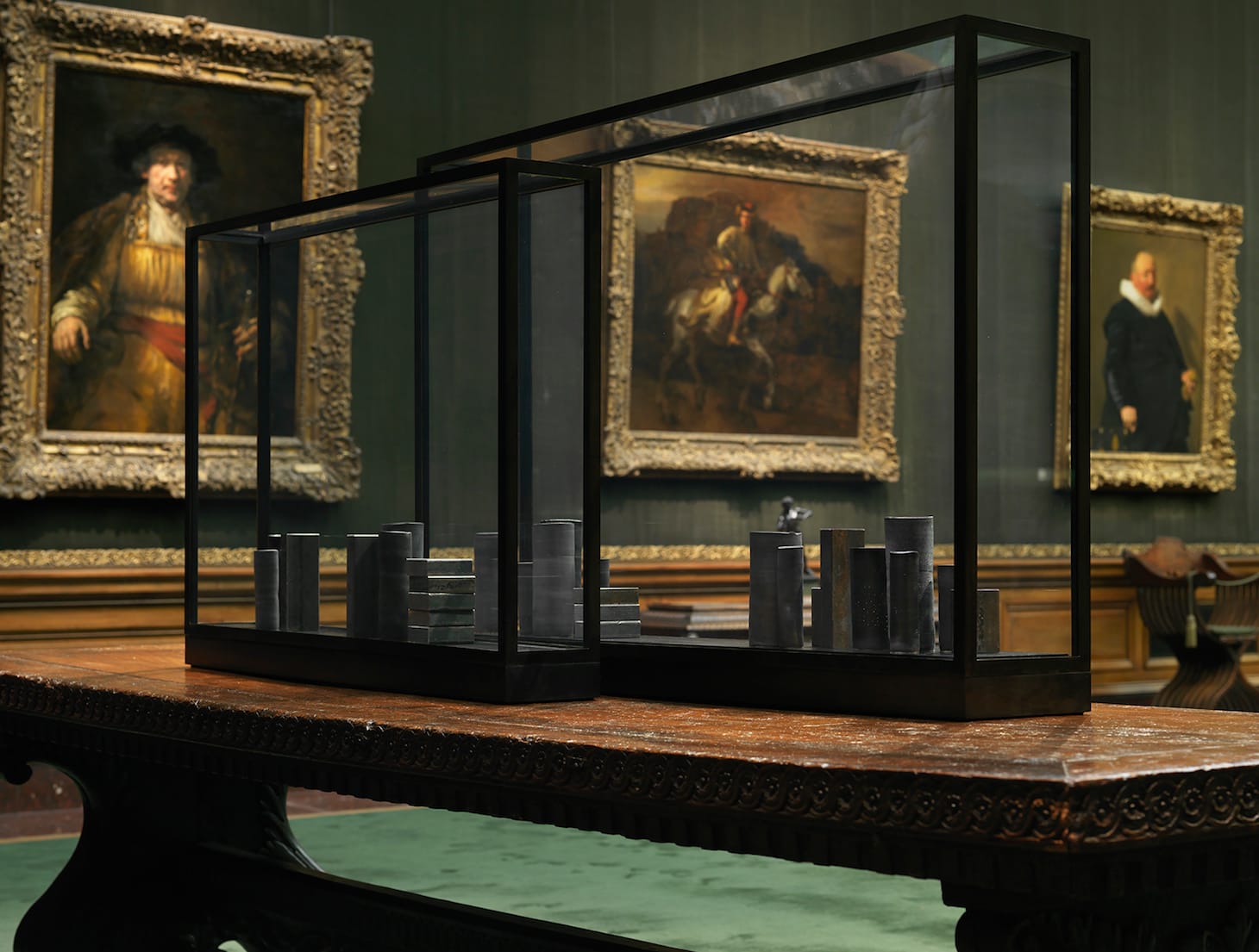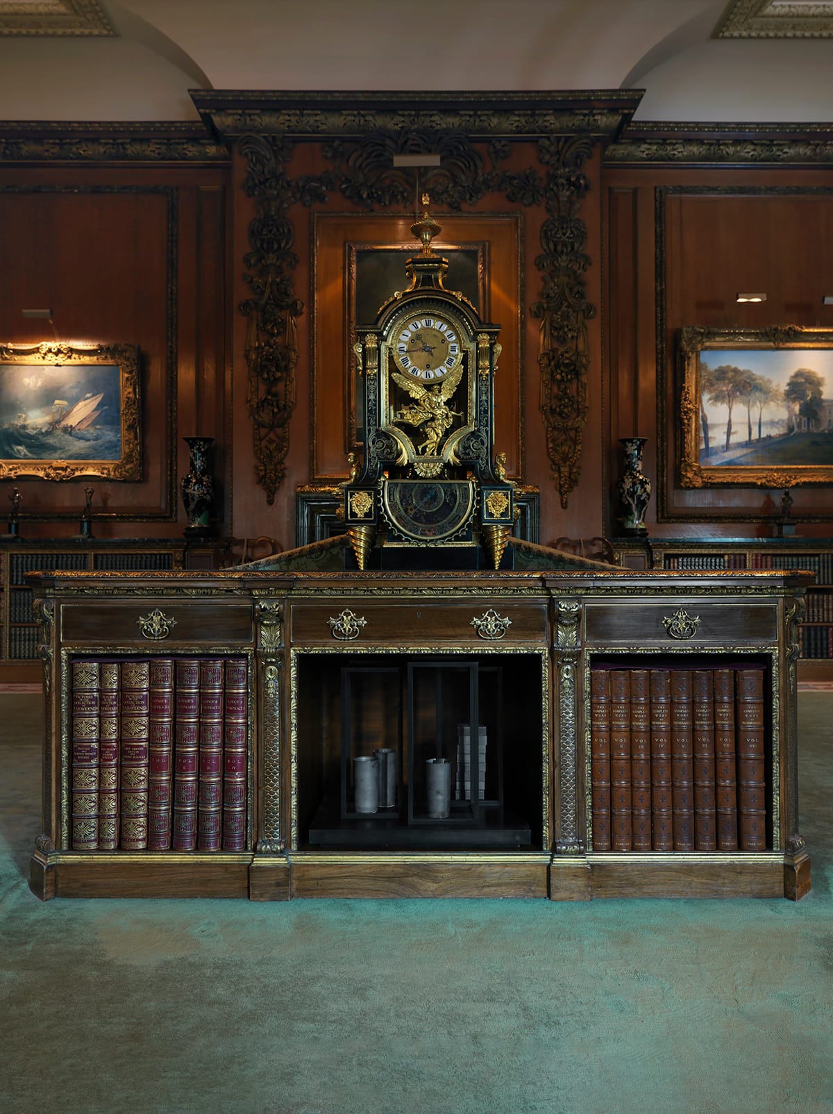 In the Library, de Waal has removed a dozen volumes from a low bookshelf and replaced them with three glass vitrines containing strong looking, black vessels and pieces of steel. The choice of materials speaks directly to Frick’s personage and fortune, and the substitution of “an alchemy” (2019) for books reminds the viewer that steel money formed the foundation of everything in the house. De Waal describes this relationship as “steel into wealth, and of course wealth into art.”