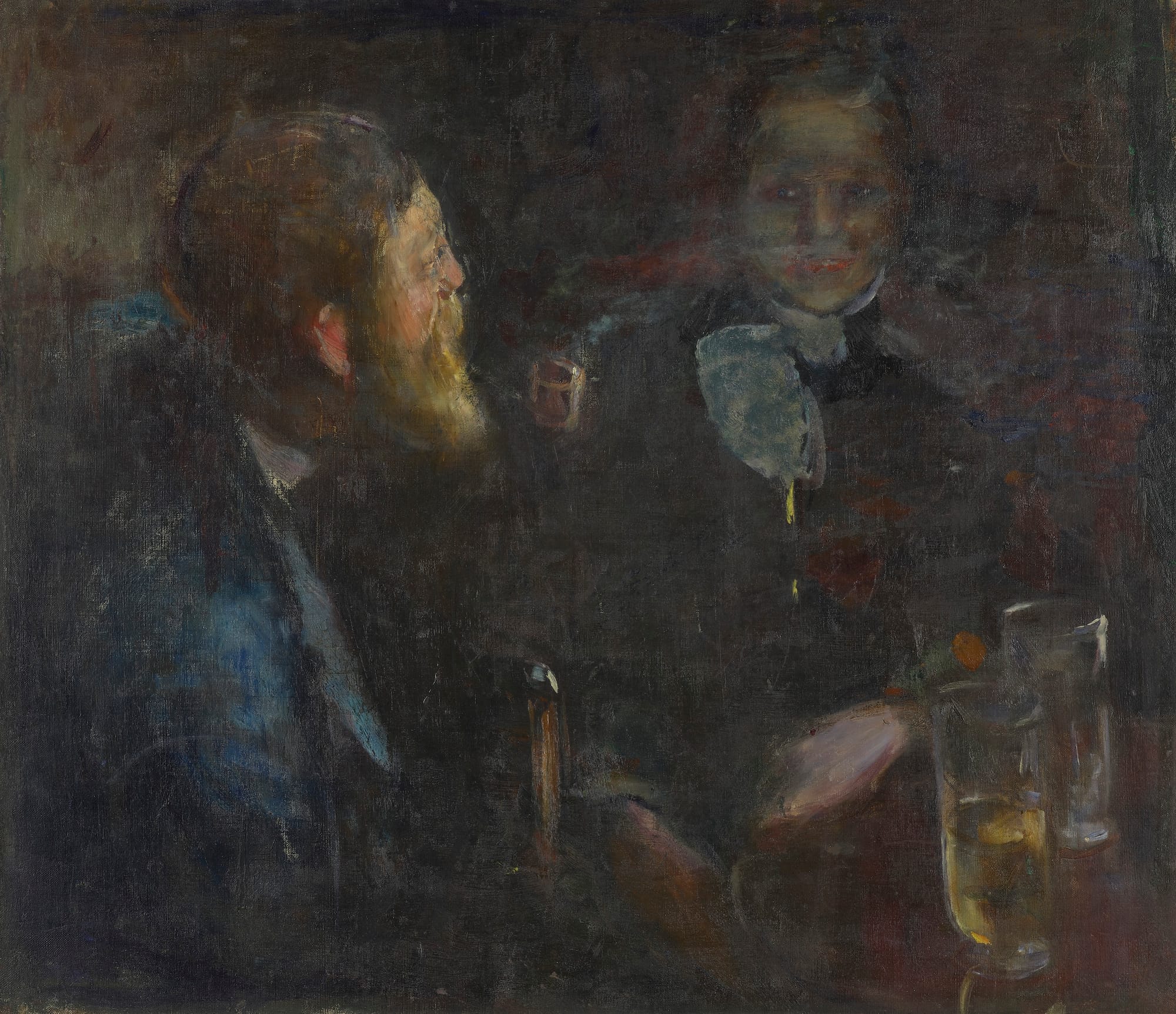 Yet further explanation is what the distracting wall labels want to give us, almost comically so: The wall label for arguably the most interesting piece in the show, “Tête-à-tête” (1885), declares that in this image of a couple drinking in a dive, “the glint of the woman’s teeth and her reciprocal gaze suggests the attraction is mutual, reinforcing the bohemian belief in women’s liberation.” It is wildly presumptuous to conclude that Munch intended this specific facial grimace as representative of a whole sociopolitical movement. Incidentally, the lighting of the piece results in an obstructive reflective glare, hiding the subtlety of its muddiness.