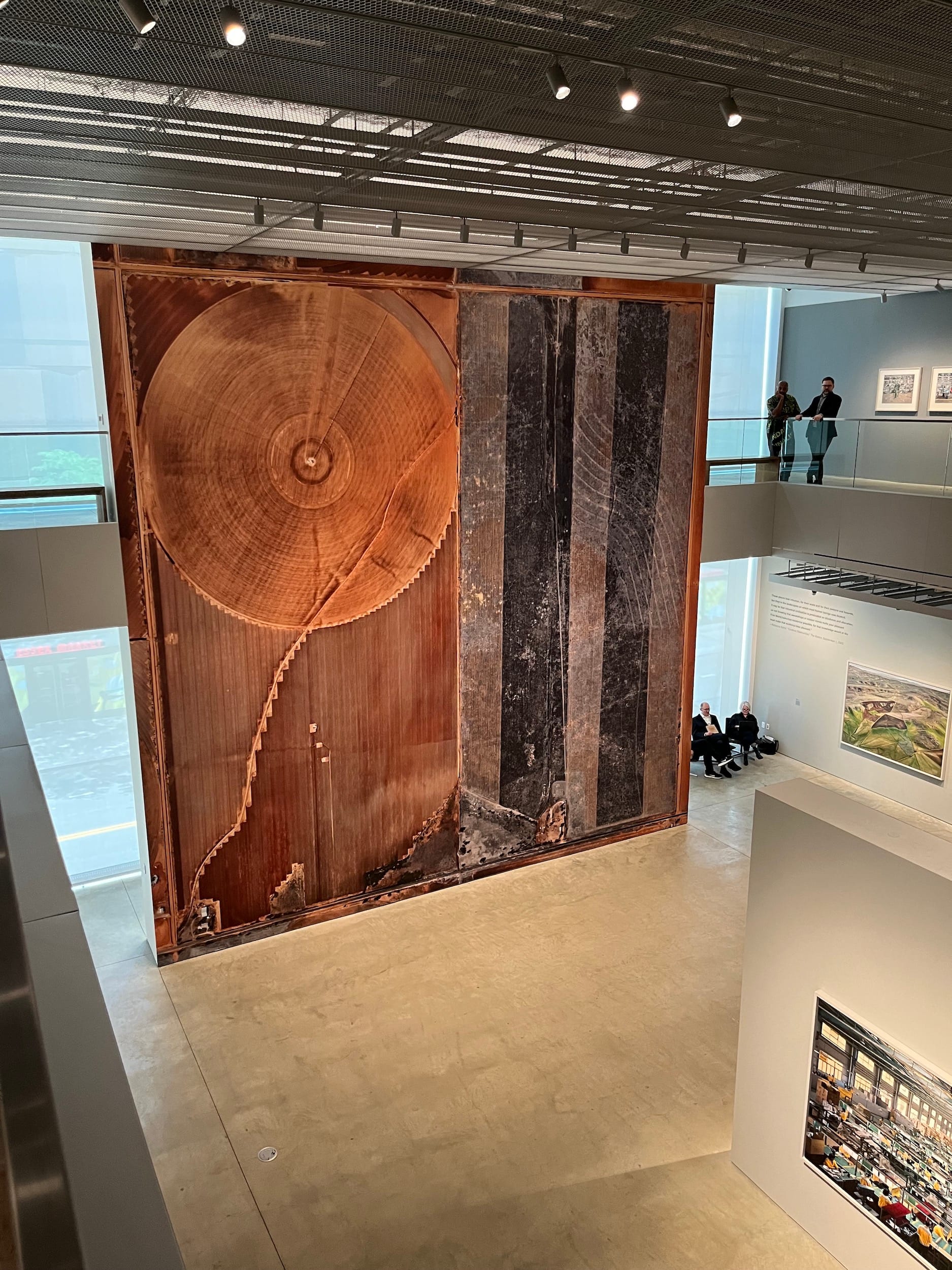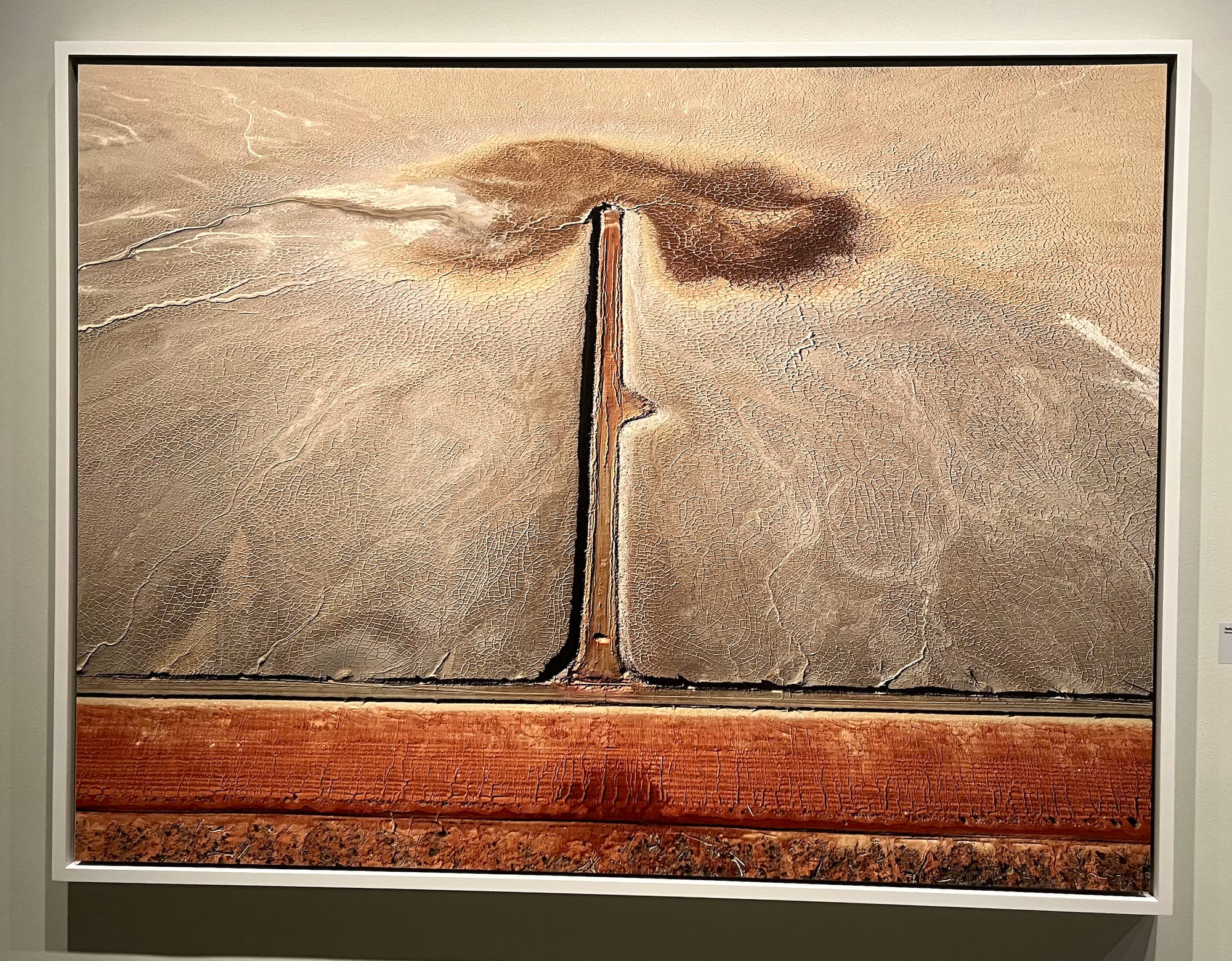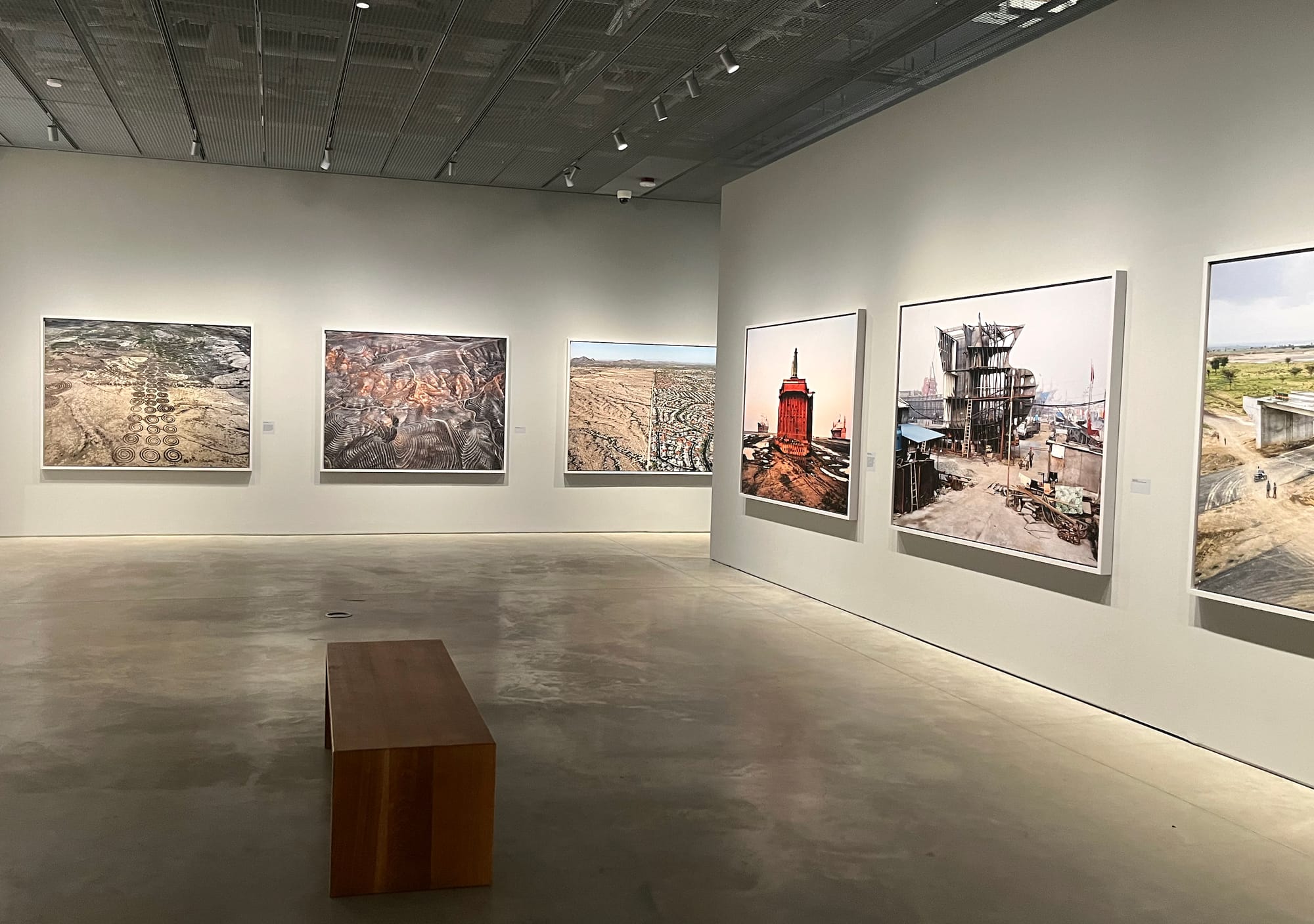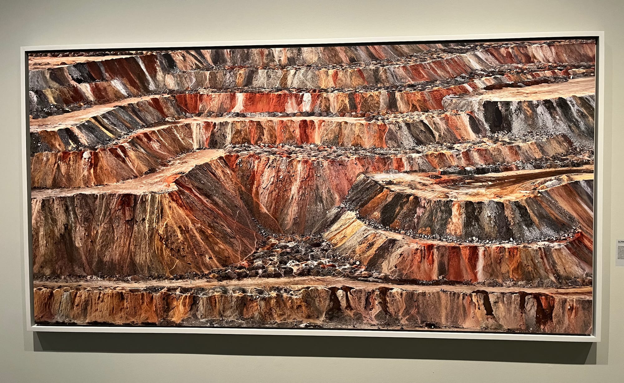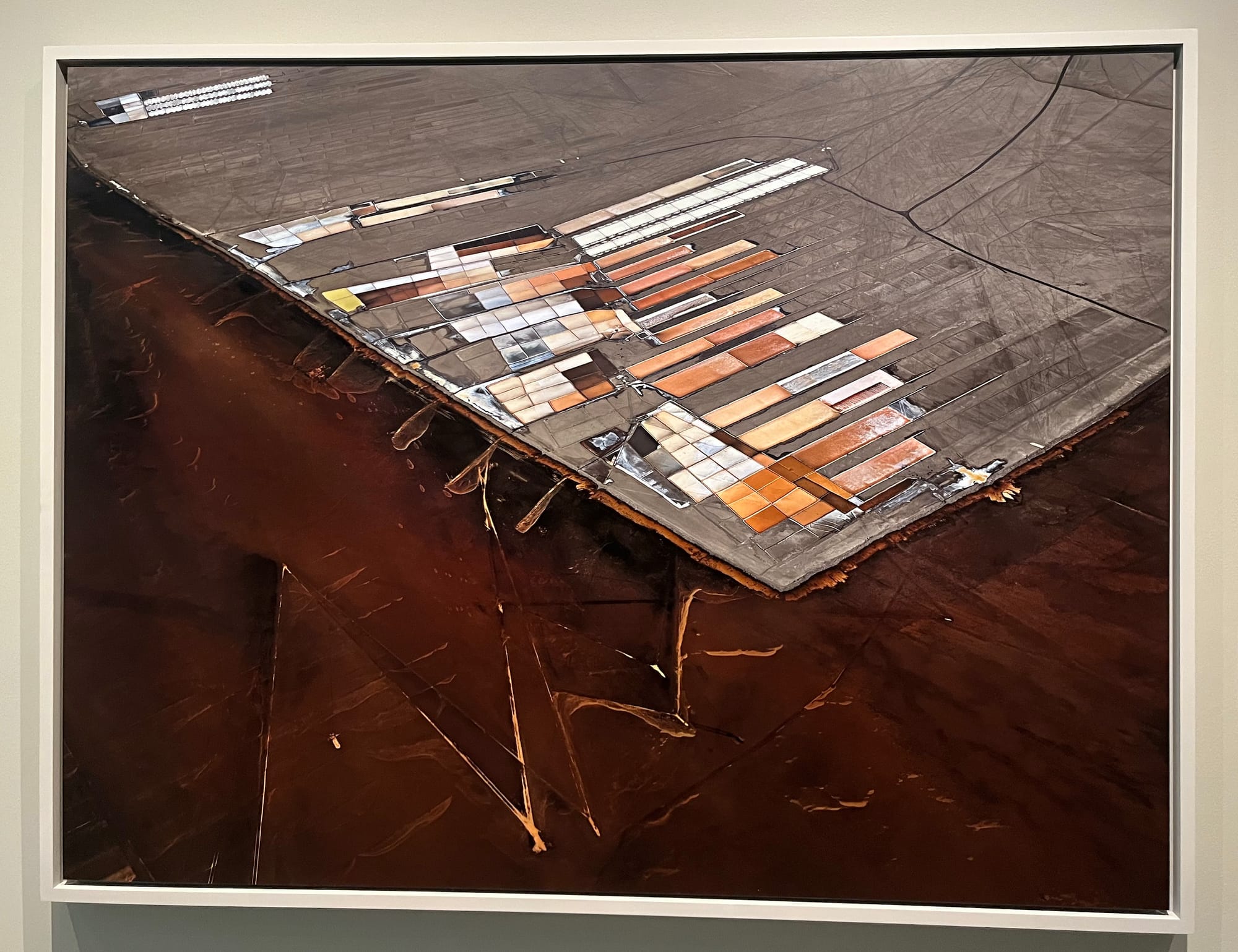 Even by that standard, the exhibition’s 28-by-28-foot mural “Pivot Irrigation #8, High Plains, Texas Panhandle, USA” (2012) stands out. The distant overhead view and subdued color palette transform farmland into an almost abstract composition, in which the pictorial space is divided into textured, geometric browns on one side and alternating vertical stripes of washed out blues and grays on the other. A teensy farmstead occupies the bottom left corner and the roads running parallel to the edges of the picture plane serve as a clever framing device. But the two-story-tall print’s physical size produces its most dramatic effects. It dominates the central gallery, dwarfing visitors in a manner akin to the quarry cliffs that sometimes loom over the ant-like human figures in Burtynsky’s other landscapes, such as the miners digging for cobalt, for a couple dollars a day, in “Dry Tailings #1, Kolwezi, Democratic Republic of Congo” (2024).