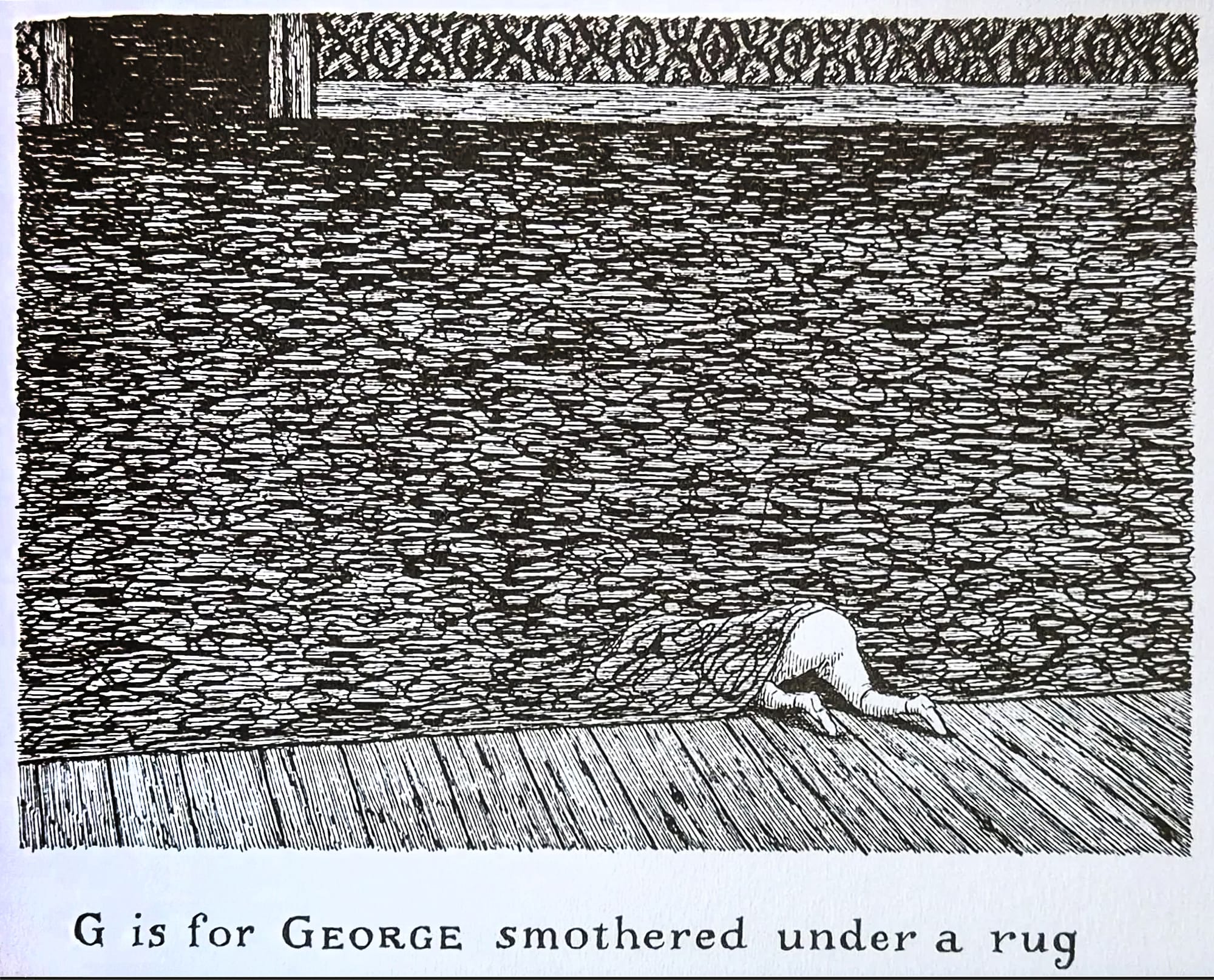 “I’ve been murdering children in my books for years,” Gorey quipped in a 1977 interview. The artist, an epic New York enigma (proto-Goth, ballet superfan, fur-fashion icon who never had kids himself), created such indelible images as a pair of tiny legs emerging from under a vast rug, rendered in scribbles, within a gloomy Edwardian interior. “G is for George smothered under a rug,” we read, and all the fears life ever threatened us with flood in.