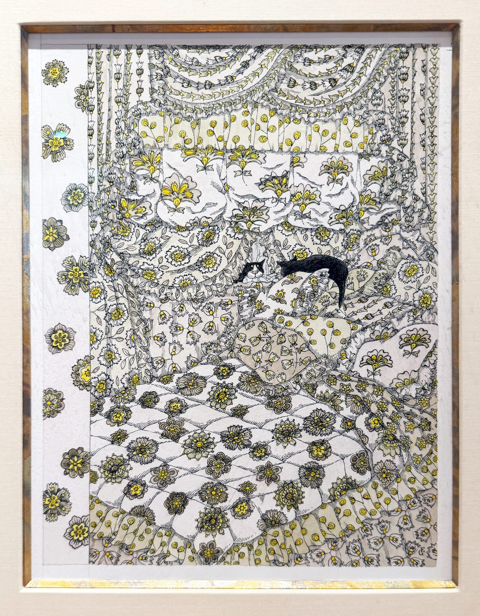 Still, his idiosyncratic visions sometimes shine through even these workaday creations. His illustrations of English-French poet Hilaire Belloc’s Cautionary Tales for Children (1907) — his half-century predecessor and clear influence — blend seamlessly with his own obsessions. Other drawings, like those for A Clutch of Vampires (Raymond T. McNally, 1974), share his atmosphere of gleeful morbidity. (Gorey won a Tony award for his stage design of the 1977 Broadway play Dracula). His New Yorker cover of two cats luxuriating amid a magnificent botanically patterned bed, submitted in 1992 and published posthumously in 2018, showcases both his ailurophilia and his inventive pen-and-ink maximalism. But all in all, we aren’t in the same uncompromisingly eerie movie as that doomed little boy crawling into the abyss. A rich eclecticism prevails here, but it doesn’t feel like his freak flag is flying at full mast.
