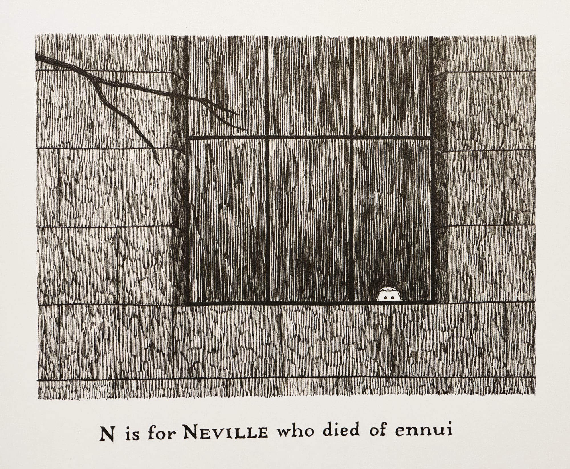 What I find so remarkable about Gorey is the finely tuned aesthetic line he walks while quite literally killing his darlings — the children that populate his work. He was a master at detaching the ghastly scenarios he crosshatched so that they became both deadpan and winkingly absurd. But I’d peered into the shadows of his oeuvre, which includes Dadaesque murder mysteries, creature fantasies, and even promiscuous adult stories (though the author claimed to be practically asexual), before. I was looking forward to a deeper immersion.