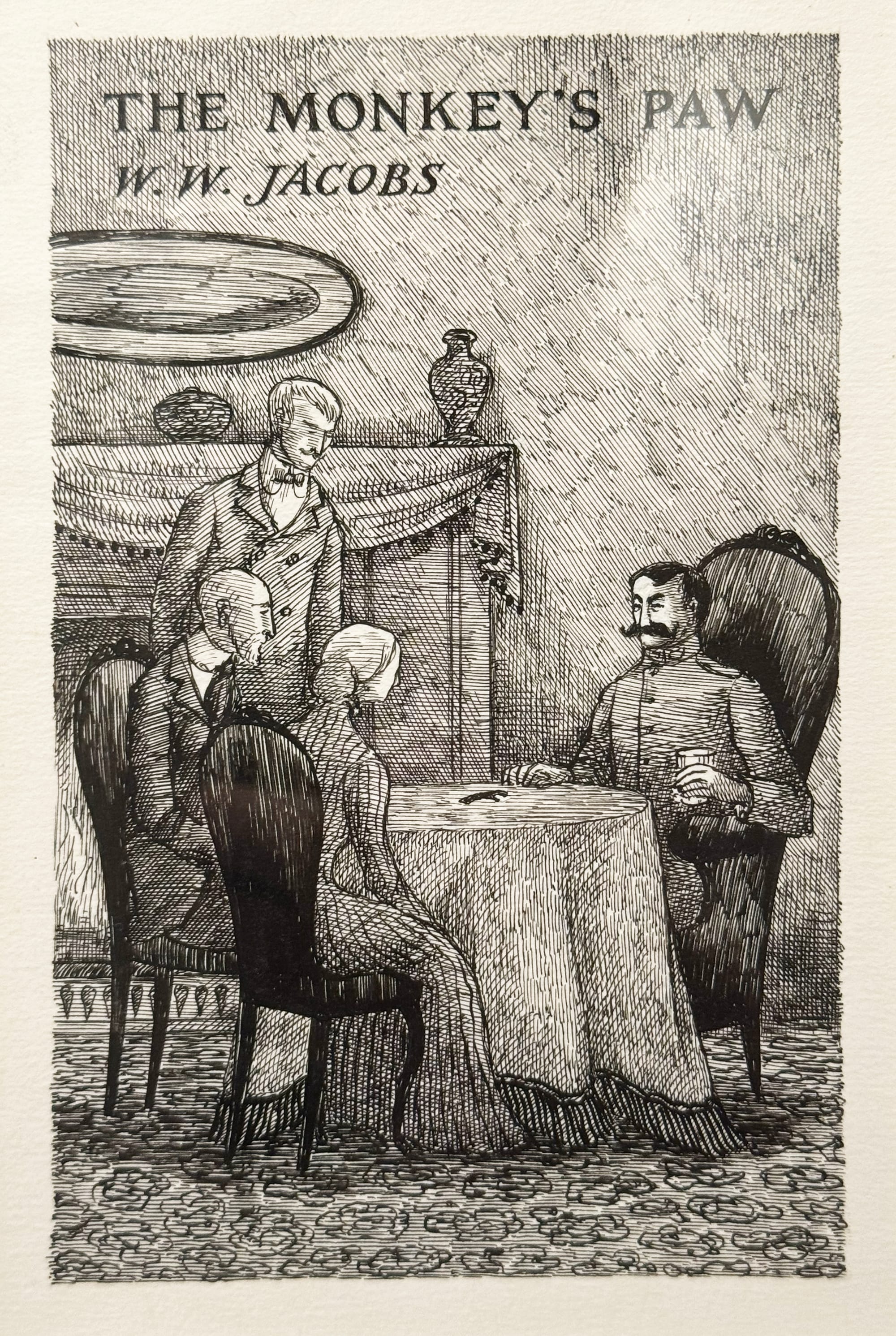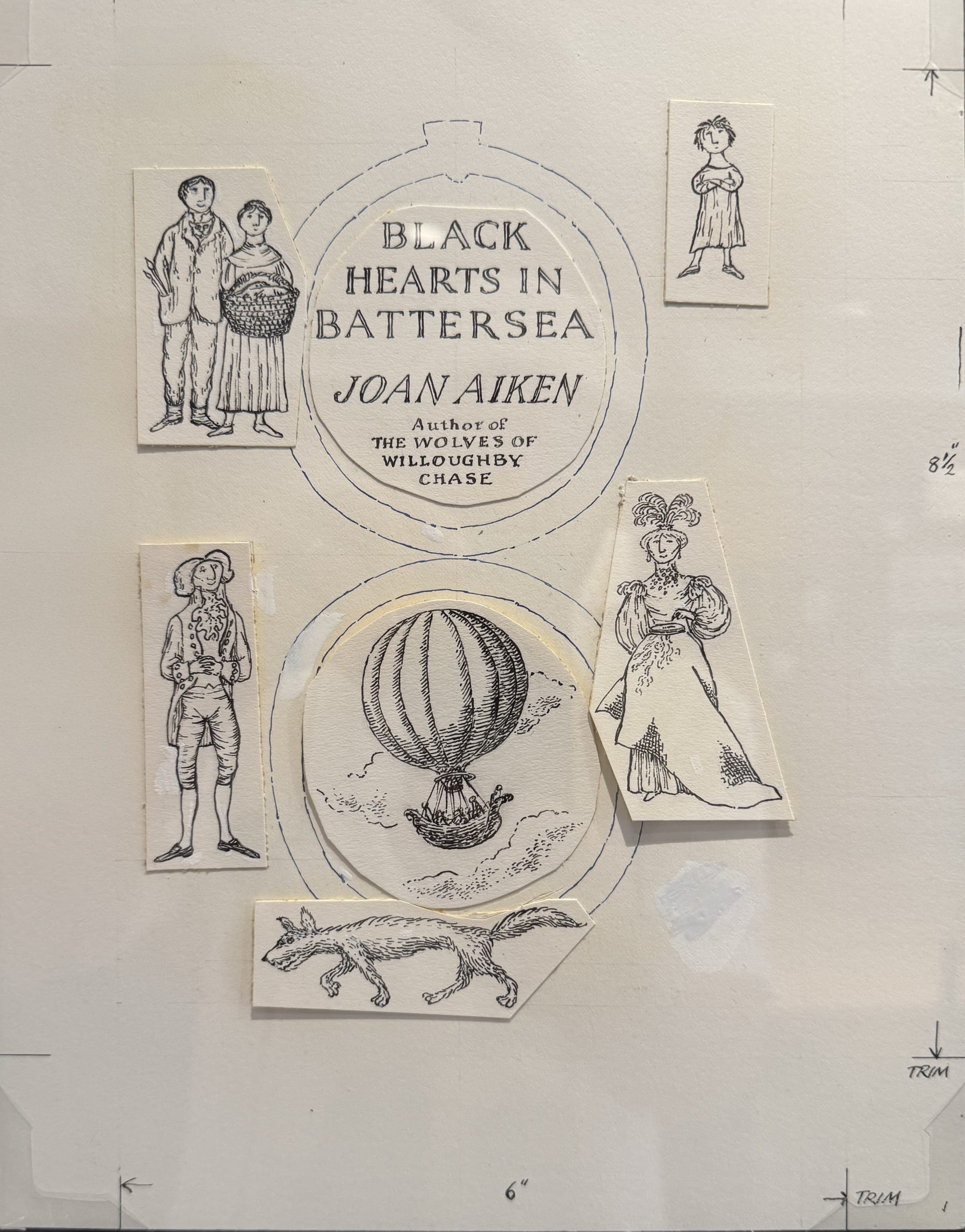 Seeing his work in person provides a rich reward anyway. The shimmer of black ink, the cut-and-paste and hand-drawn printer’s crop marks — these transport us to a time before computers, the heady midcentury New York City publishing days in which Gorey pranced around like illustration royalty in his double-breasted coyote- and seal-fur coats. We also get to witness his evolution: The early oblong heads (E.T.’s cousins) and long pointed feet give way, by 1959’s Monkey’s Paw, to the deadpan figures that became his hallmark. We can certainly see why authors were overjoyed upon receiving news that Gorey would make pictures for their books.