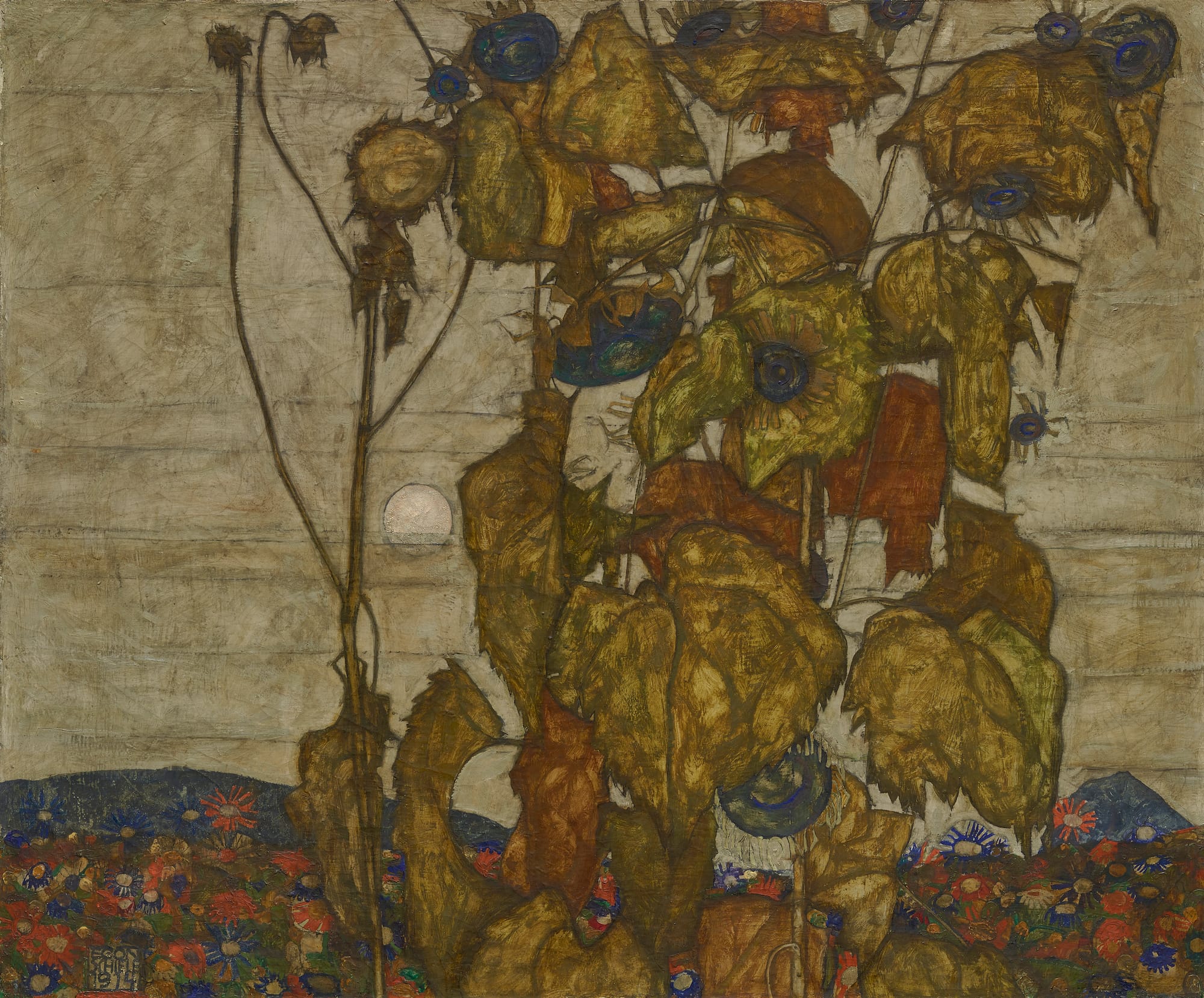 At 16, Schiele left his provincial hometown of Tulln, Austria, to become the youngest student at the Vienna Academy of Fine Arts. He developed his signature artistic style under the tutelage of his friend and mentor Gustav Klimt. The early “Sunflower I, 1908” is a jaded foil to Vincent van Gogh’s vivid paintings. It foreshadows Schiele’s disquieting, severe style, which predated the German Expressionist movement that gained popularity after his death.