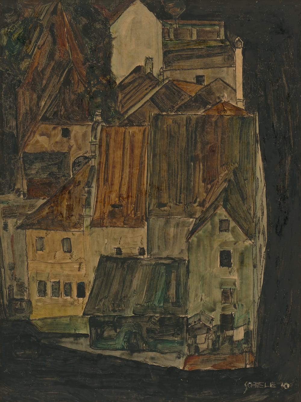 In one of Schiele’s last works before his death, “Town among Greenery (The Old City III)” (1917), he paints an abstracted version of Krumau. He sandwiches the town between nascent green leaves, and in a rare decision, paints townspeople onto the city streets. It’s an emergence from the artist’s eternal fall, a glimpse into the spring that he never got the chance to explore.