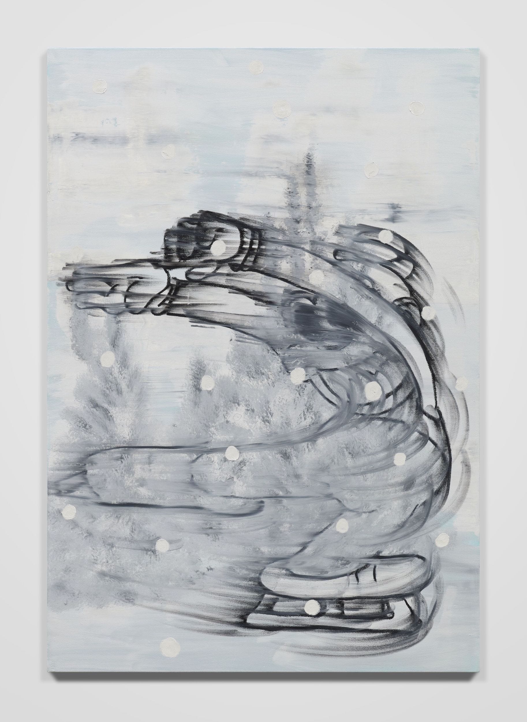 Gary Simmons’s new paintings for Thin Ice use his signature tactic of blurring to do something other than making his figures seem ghostly. Instead, the smeared renderings of phases of a skater’s “port de bras” movements represent a uniquely American mashup of a caricatured blackness made to mimic idealized European forms. The artworks indicate a dilemma at the heart of the popular culture of the United States —Seph Rodney