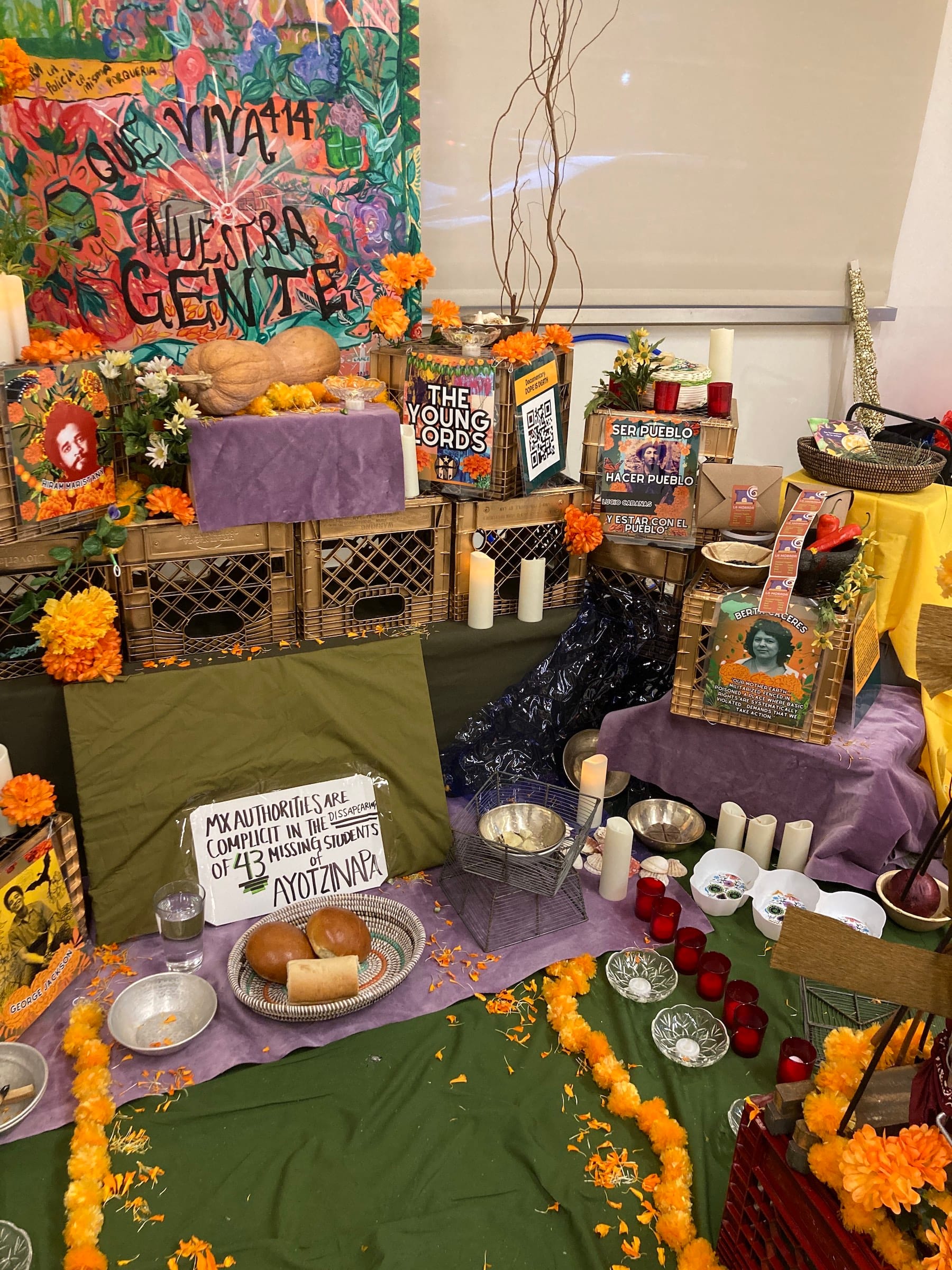 With protest banners and signage, the altar also connects these past movements to ongoing grassroots struggles against institutional oppression and state violence, such as the current effort to hold Mexican authorities accountable for their complicity in the September 2014 mass abduction of 43 students from the Ayotzinapa Rural Teachers' College.
