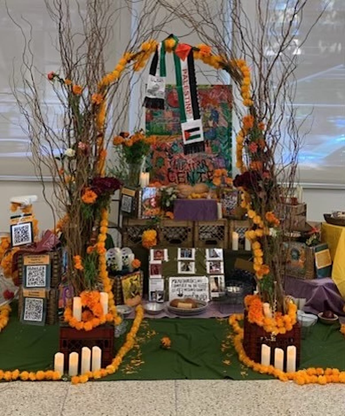 “I told them that I had included the Palestinian flag because there are so many Palestinian families that have been displaced and murdered and Israel has support from the US and other imperialist powers,” Baizan told Hyperallergic. Baizan pointed out that the museum staff did not appear to take issue with the altar’s reference to the Ayotzinapa kidnapping — another element that was not included in their proposal.