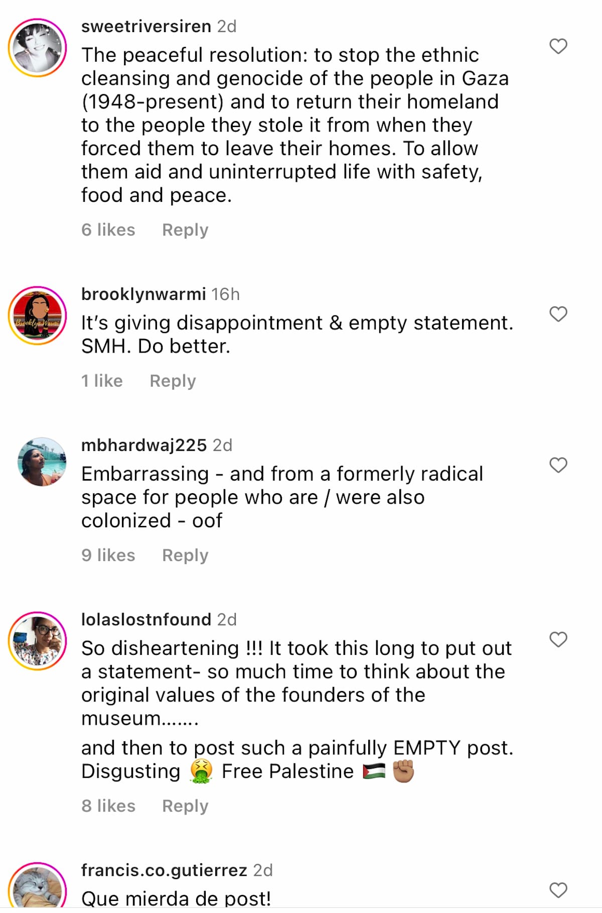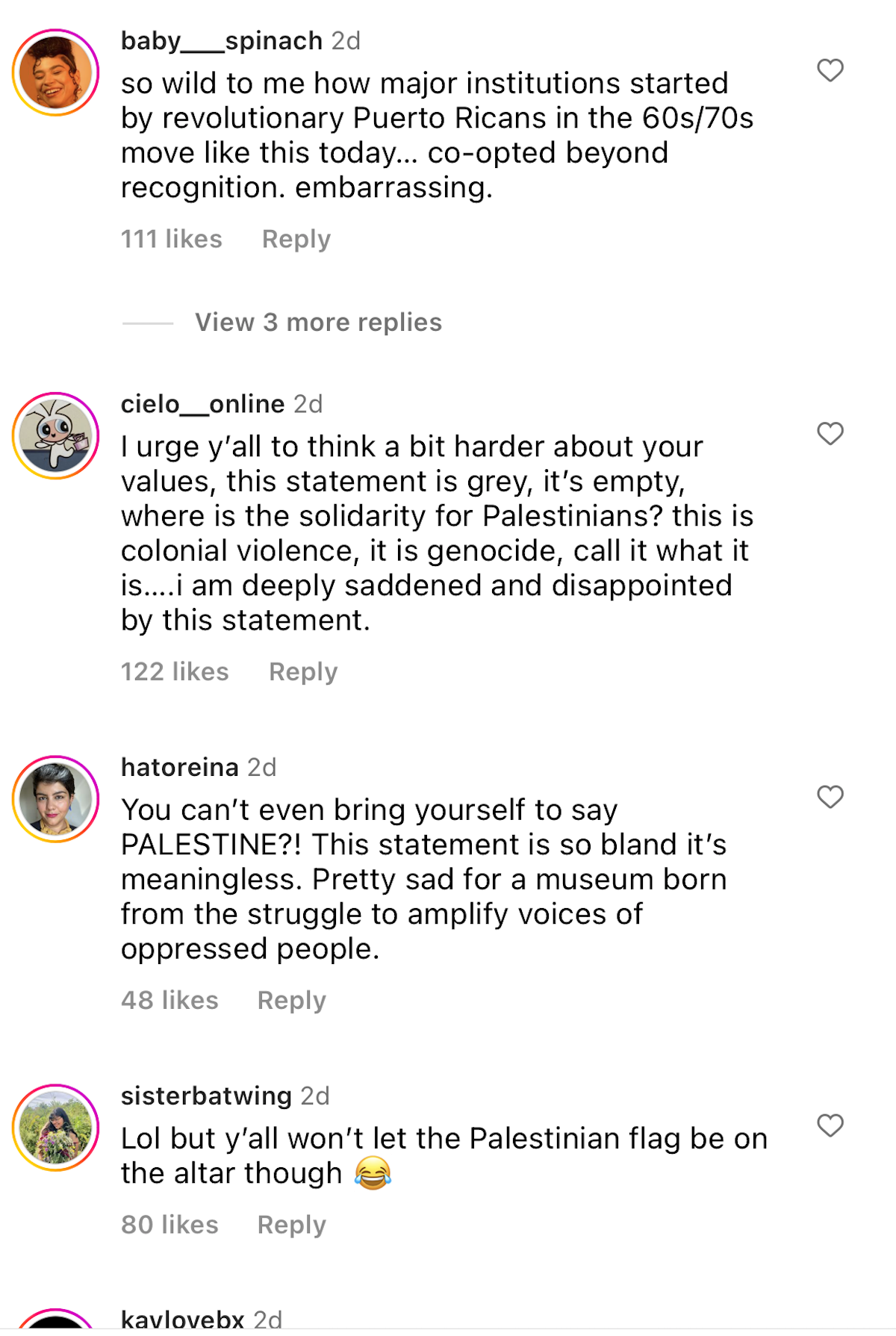 Below El Museo’s post, users on social media expressed disappointment with the museum’s statement, which they observed failed to mention Israel’s occupation of Palestine as well as the current airstrikes and collective siege that the Israeli state has been inflicting on Palestinians since October 7.