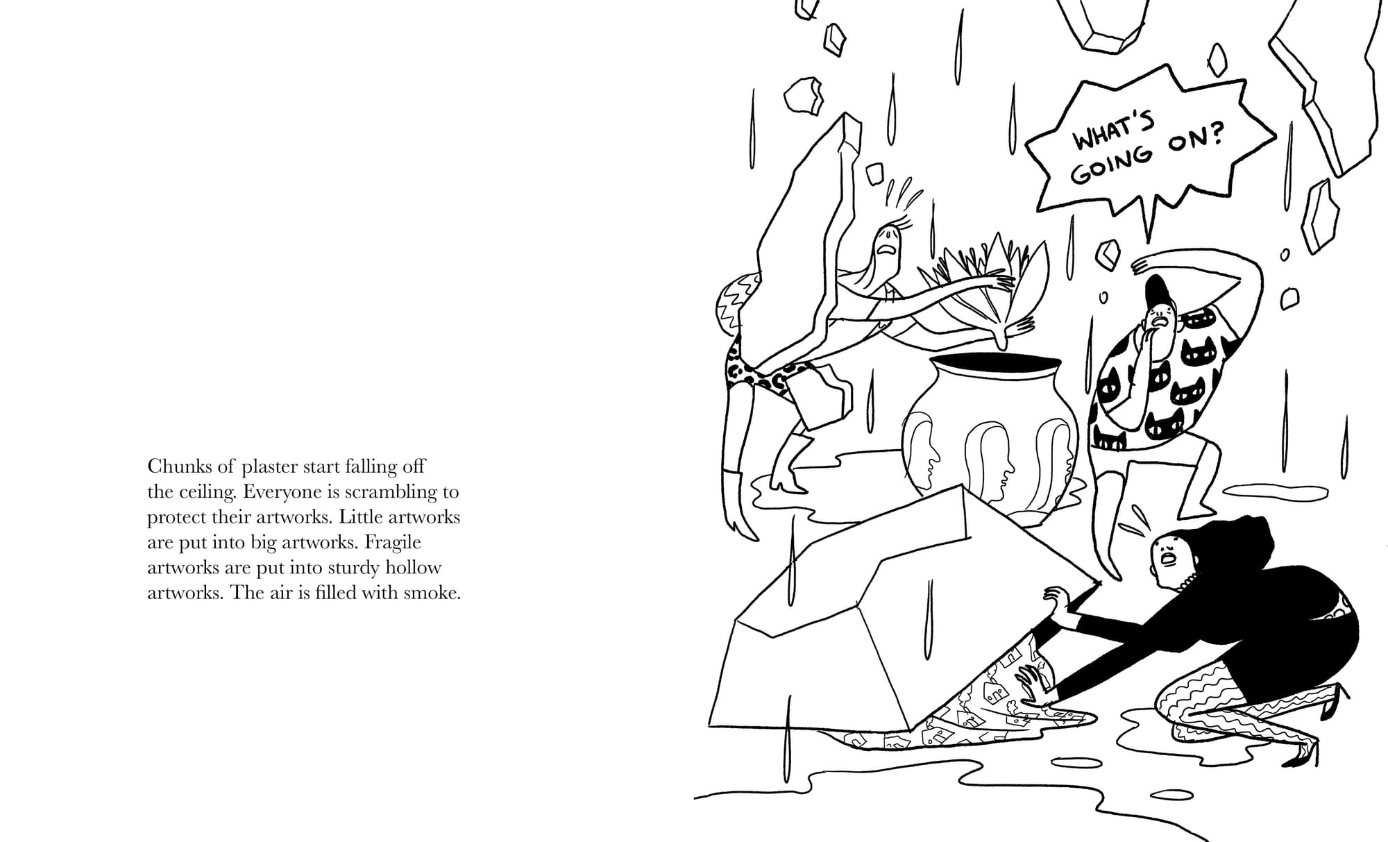 Why Art? is divided into two parts. The first is a didactic treatise on the different ways to categorize art, including color and size. She glances over artworks that are aesthetically pleasing but nothing more, citing “beautiful empty containers” to put things in and “beautiful fabrics” to drape over ugly things. She calls them “concealment artworks,” which are great from a commercial standpoint but can make artists feel like sell-outs. Based on the twee graphics that illustrate these examples (over-sized flowers, curvilinear lines) they might well be a jab at Instagram-ready art.