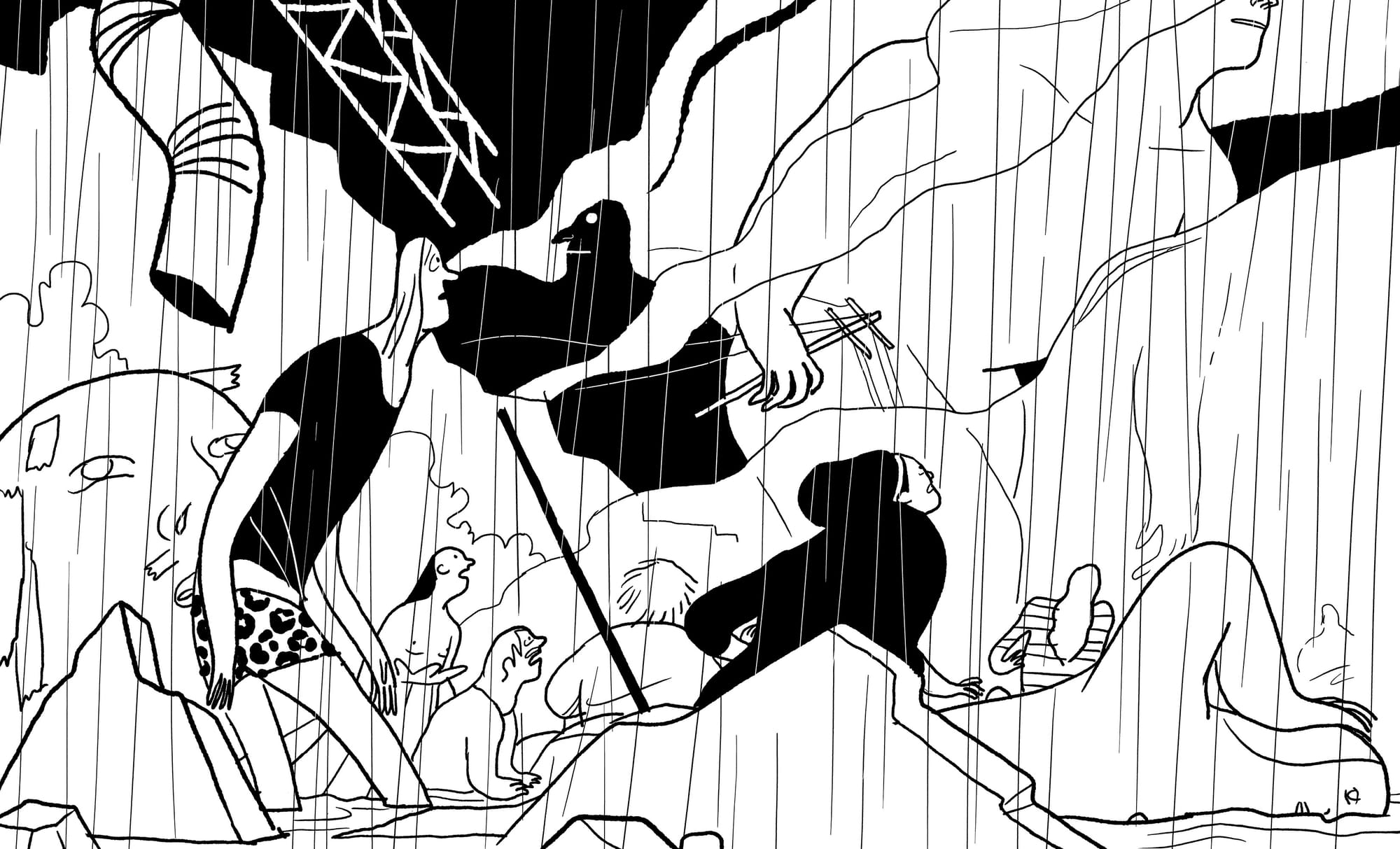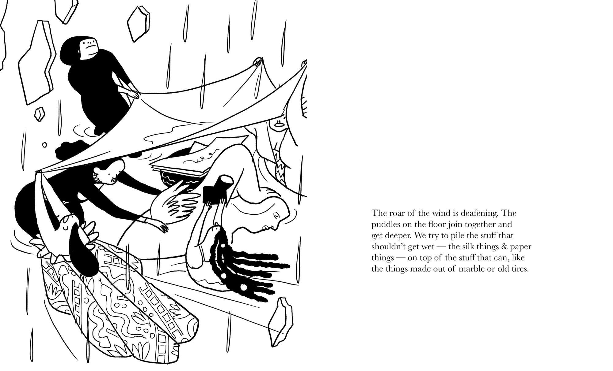 When it’s time for the artists to present a group show, an apocalyptic storm begins to rage. “[W]e’re not strong, or very brave. Our only instinct is to get away,” says the narrator. Once they find shelter, they stumble upon a shadowbox. Soon its inhabitants literally pull in the characters. Dolores becomes a God-like figure, creating a tiny replica of herself. Her friends follow suit, fashioning their whole personal universe in miniature. “Because we built these tiny versions ourselves, we made them a little closer to how we’d like to actually be,” says the narrator. Dolores then arbitrarily destroys all that they created, echoing the apocalypse that devastated at their gallery show. Yet she has a plan. To the slightly improved versions of herself and her friends, she requests, Show us how to save ourselves. Show us how to be brave.