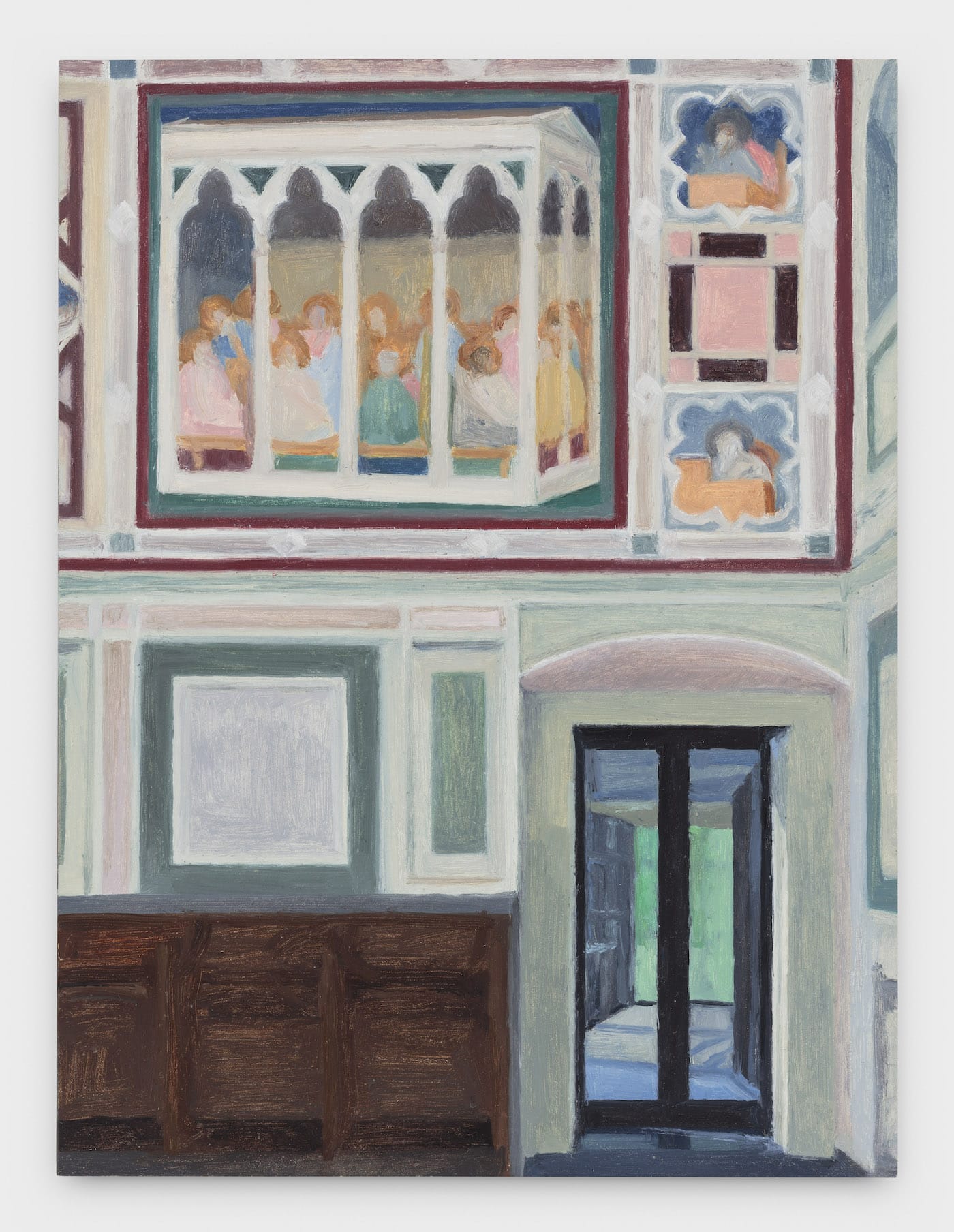 In the companion painting, the rectangles are salmon-colored and aligned vertically and horizontally, echoing the architecture. In both paintings, the rectangles of light reflected on the cool, dark wall are as palpable as the architectural elements. Their fleeting presence reminds us that we exist in time, even if we think of this moment as timeless.