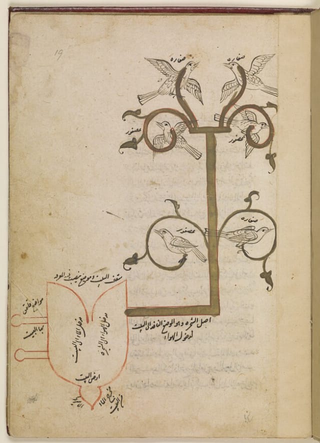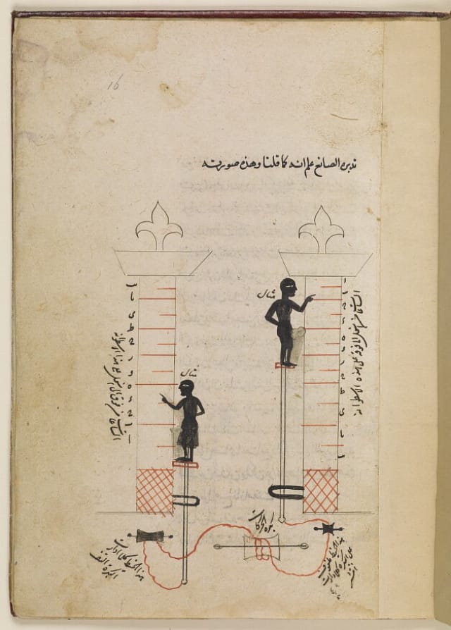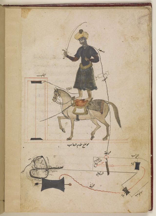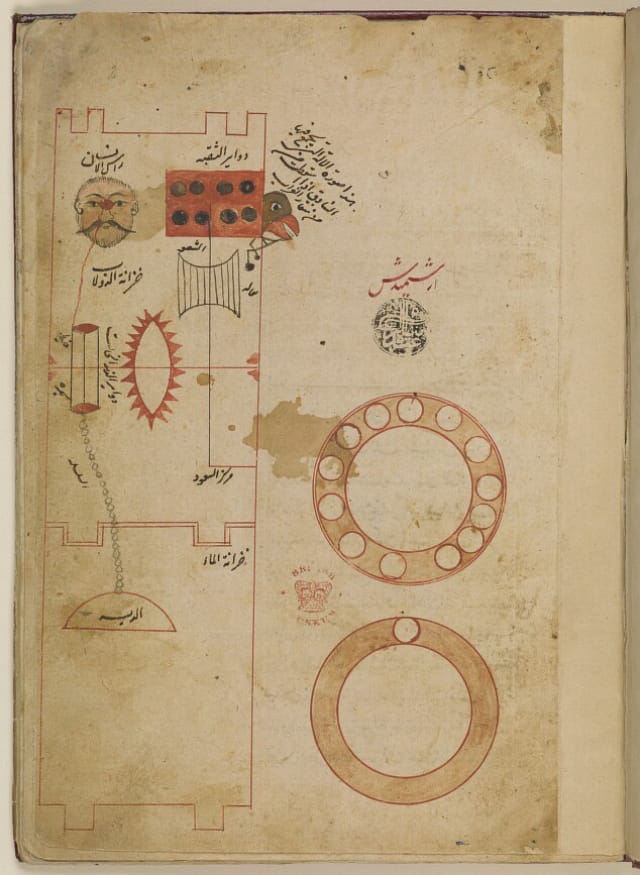 Beyond wondrous water clocks, the Qatar Digital Library also features intriguing documents like alchemical treatises from the 11th–12th centuries, astrolabe diagrams, mathematics texts, astronomical charts, and historic mapping from the 9th to 19th centuries. Below are more illustrations from the 16th-century water clock manuscript, including a robotic executioner on horseback, a bird that drops cymbals as a man’s eyes change color each hour, and two human automata who rise and fall while pointing at the time.