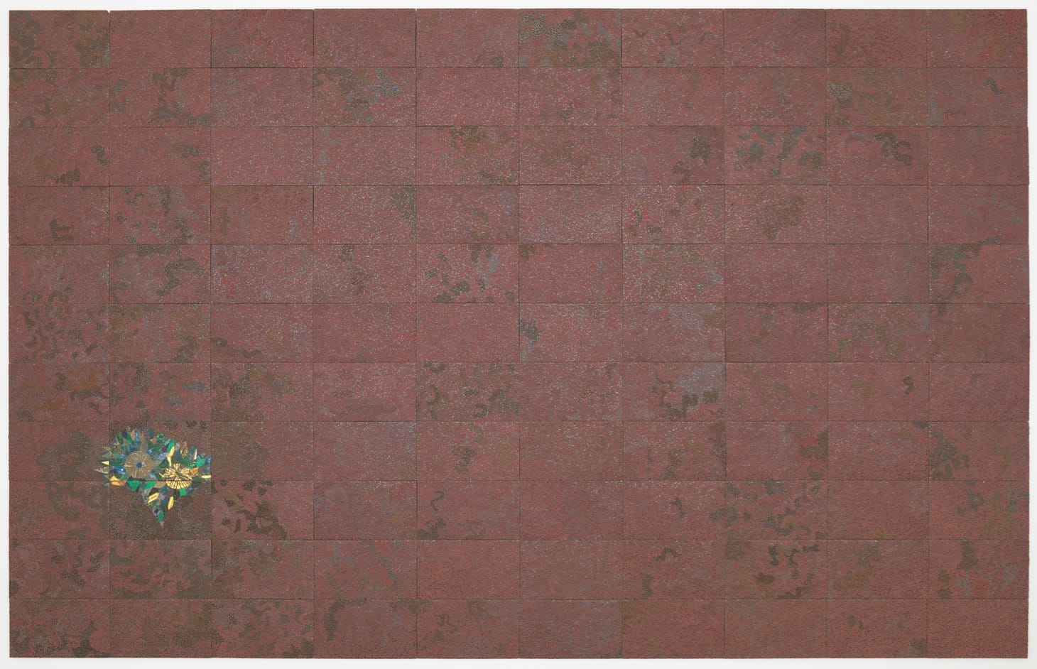 Tracy Adler is telling us that, “… this is why you need to experience the work in person.” Adler is the director of the Wellin Museum, and she is talking about the work of Ethiopian artist Elias Sime to a small clutch of writers, including me, who have come up to Clinton, New York, to see a survey of his work that she has curated. It’s true. One does need to see this work in person — in order to get the full impact of it. From across a wide open gallery expanse the assemblages (let’s call them that for now) look like elegant modernist compositions of vibrant pigments that tend to resolve to discrete fields of one dominant color. But then crossing that space and regarding them at a finer resolution, one notices that they are stubbly, variegated surfaces containing intricate and convoluted arrays of wires, buttons, keyboards, circuitry, or yarn. They tend to be divided into rectangular quadrants that fit together in a grid — we find out from speaking with Sime and his working partner, curator, and anthropologist Meskerem Assegued — which make the work easier to both transport and store. As Sime tells us (in his native Amharic, with Assegued translating to English), sometimes it takes years to make a piece because upon initially finding a few strands of wire coated with plastic of a particular hue, he has to hunt and and look for more, in marketplaces, at auctions, in order to find that color in enough quantity to become part of a large composition.